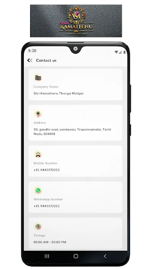 Shri Kamathenu Thanga Maligai was founded in 1979 by Mr. V. Sivalingam as a jewellery showroom. He built and worked on it with his own effort and made it one of the best jewellery stores. Mr. V. Sivalingam introduced the highest purity in gold jewellery, 916 KDM in 1999 at Vandavasi, Tamil Nadu. Now the management is handled by Mr. Prabhakaran Sivalingam.