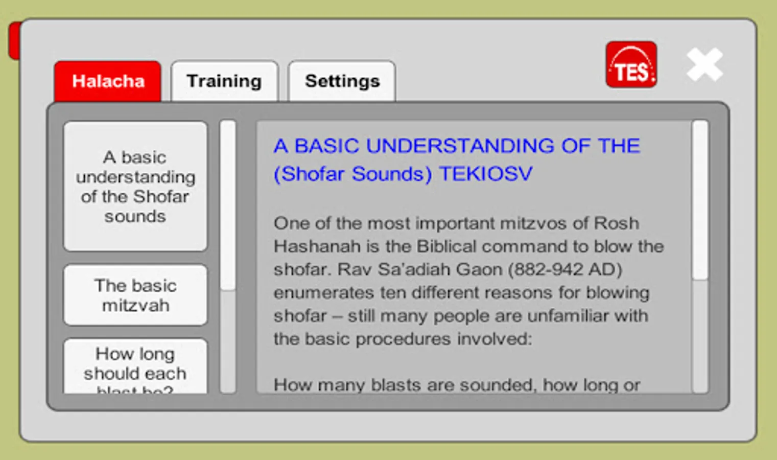 Shofar Trainer 1-2-3 is a professional software application that will help you become a professional Baal Tokeiah (Shofar Blower). Shofar Trainer 1-2-3 works just like the name - 123 and you will be blowing - and it consists of 3 Lessons. 2 stages of practice and one that is a Review and Testing Module. So it's 123 and you will Blow Shofar like a pro. Take a look at the screen shots to appreciate what this program can do for you.