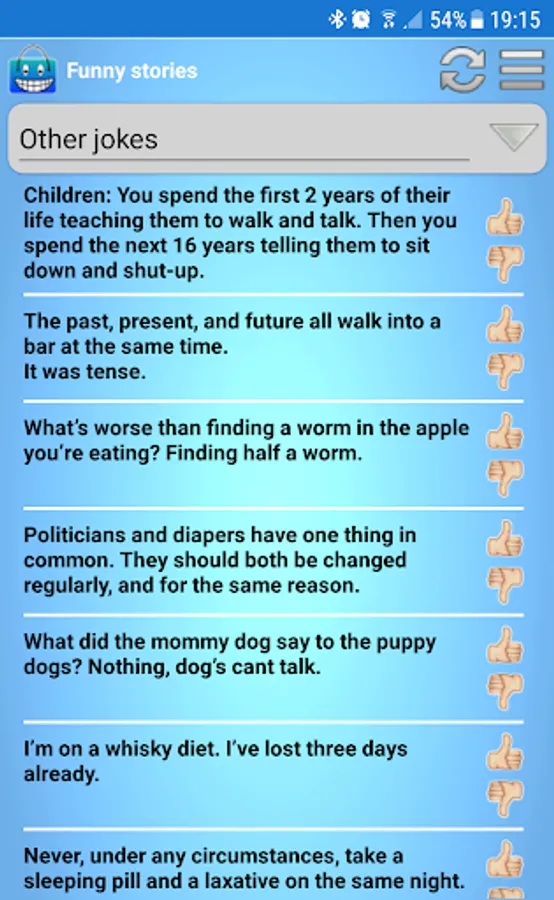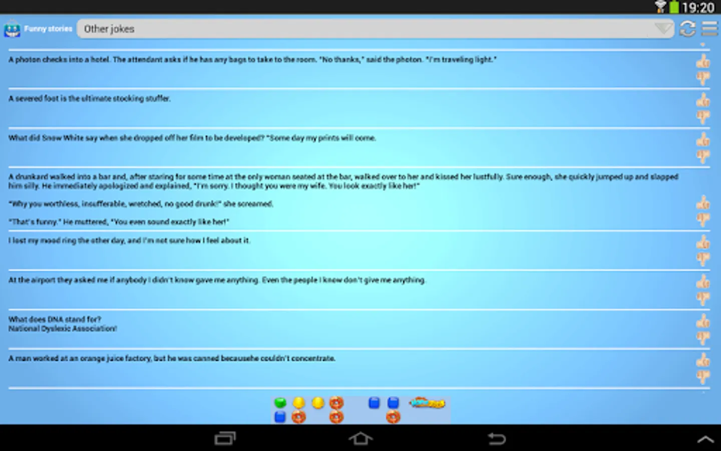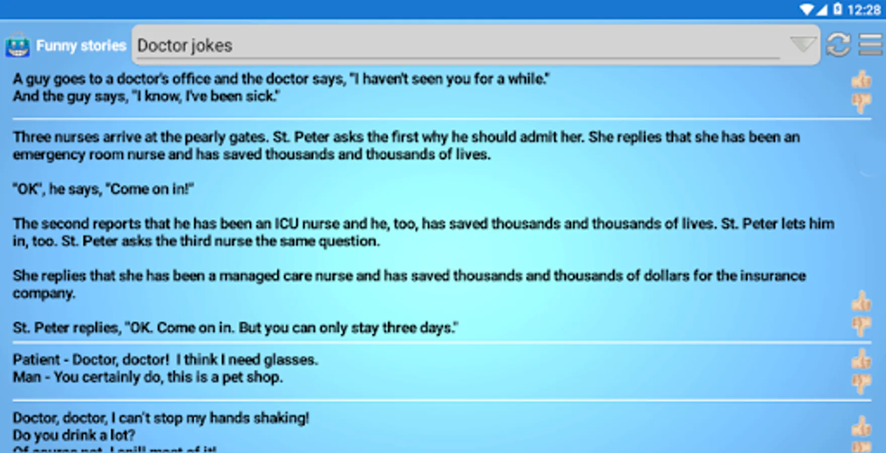 Lots of funny pictures and stories! Perfect if you want some fun reading for a while, or if you need a funny story to pull at a party. The stories are divided into different categories such as Animal jokes", "Blond jokes", "Doctor jokes", "Lightbulb jokes", "Naughty jokes" and others. A search function exists to make it easy to quickly find a favorit.