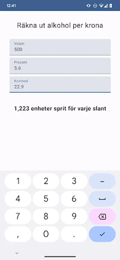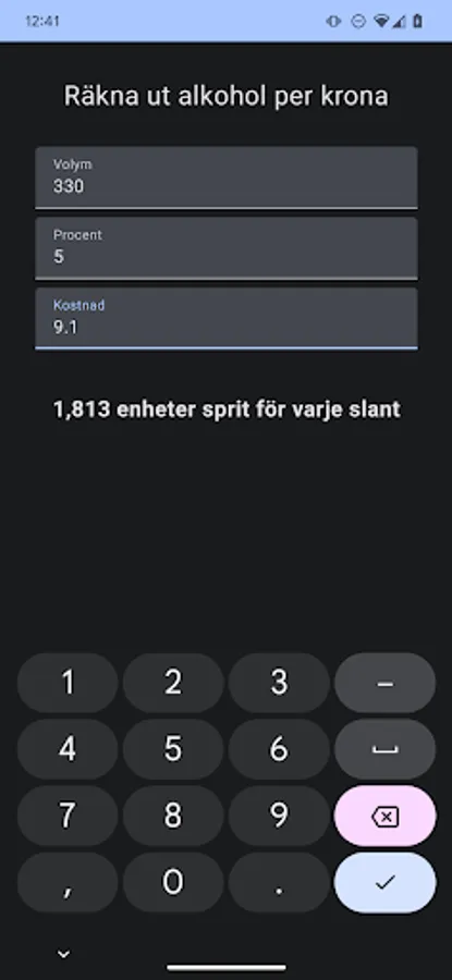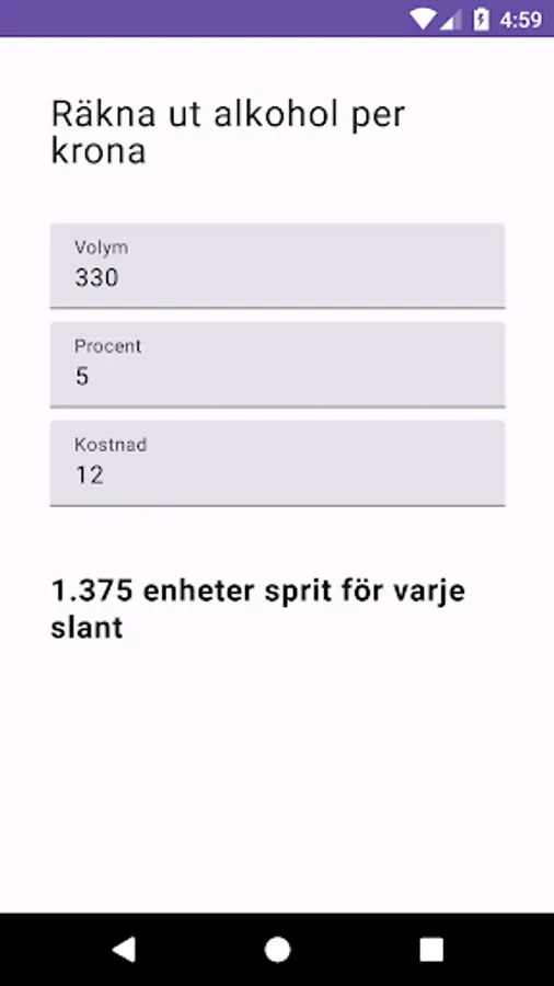 The app has a simple interface where users can compare their favorite products. Once they have filled in the information about a product, the alcohol value per kroner is shown, so they can make an informed decision about which product they want to buy.