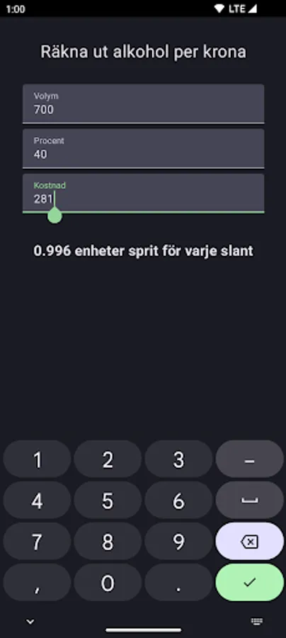 This nifty app calculates alcohol per kroner. It helps you find the most affordable option on a menu or in a store. The app shows you the alcohol value per kroner so you can make an informed decision when choosing what to buy.
