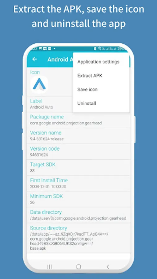 You can get detailed information about the installed apps, as well as extract the APK, save the icon of any app in your device, and uninstall non-system apps.