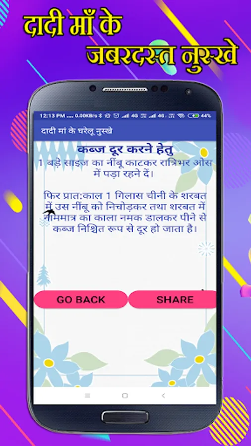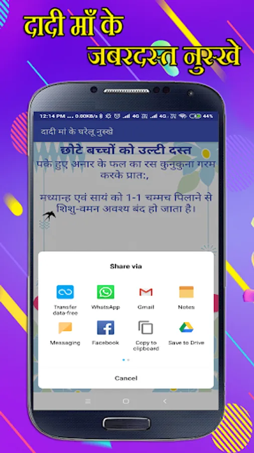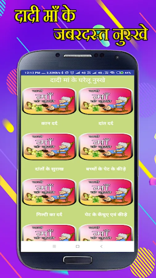App also includes Ayurvedic Gharelu Nuskhe(Ayurveda), gharelu upchar, gharelu nuske, Homeopathy Se Upchar Hindi, Dadi Maa Ke Gharelu Nuskhe For Weight Loss, Face and hair treatment, दादी /नानी के नुस्खे, Skin Diseases and Treatment, Rogo Ka Upay Bimari Lakshan Aur Upay Healthy life, Hair Problem Solutions, Natural Home Remedies, Gharelu osidiya, Hair Problem Solutions in Hindi, Homeopathy Se Upchar Hindi, Hair loss Gharelu Upchar for Men and Woman ,1500 Home Remedies