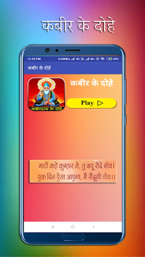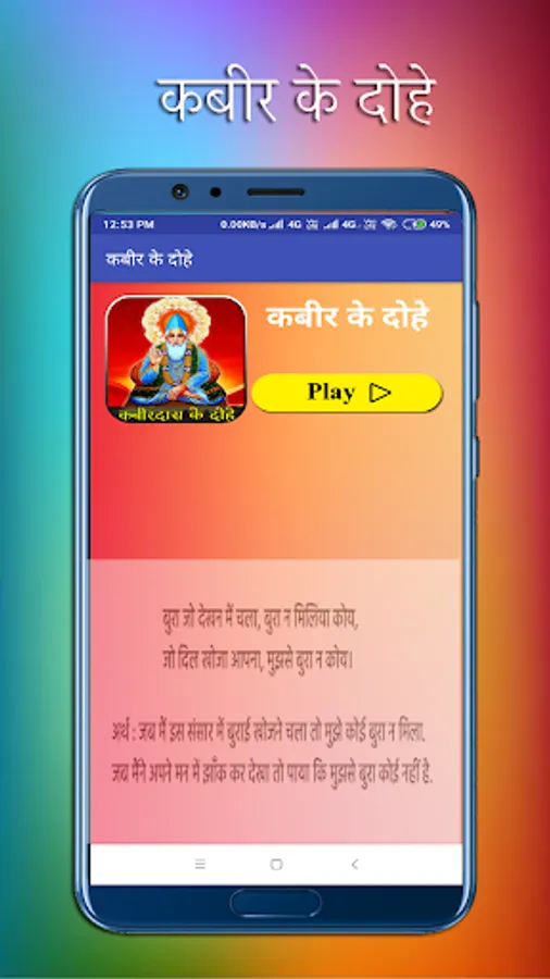 This app belongs to Kabir ke vichar/quotes in Hindi for us. In his dohas, Sant Kabir challenged the ongoing practices of all religions, sects and castes. His dohas provide a clear and true vision of spirituality. Even after centuries, his couplets are read by the seekers from across the globe. It contains sant Kabir's thoughts and amartvani/kabir dohavali. By this app we will trying for all motivational quotes in hindi for daily motivate to you like a coach