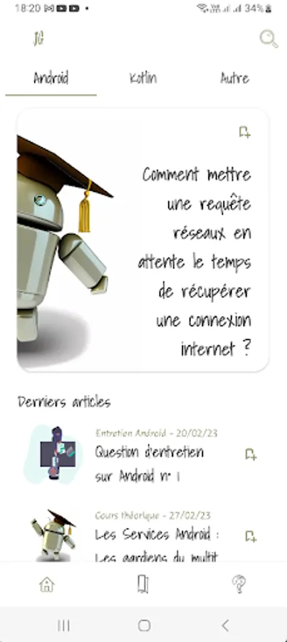 Learn Android app development from a more theoretical perspective. Study the different components of an Android application and its development, in order to learn, review or prepare for your future job interviews. Learn daily with new courses (several per week) on Android, Kotlin, Git... and then test your knowledge with MCQ.