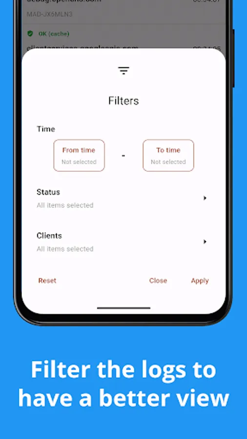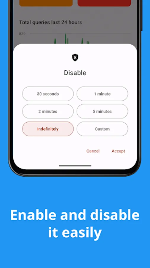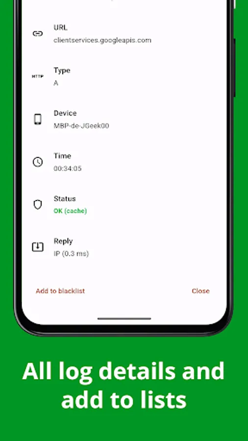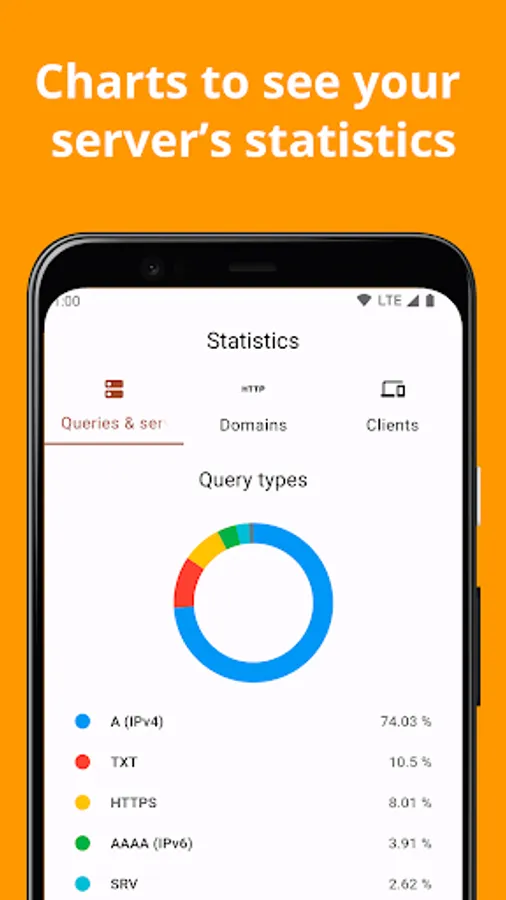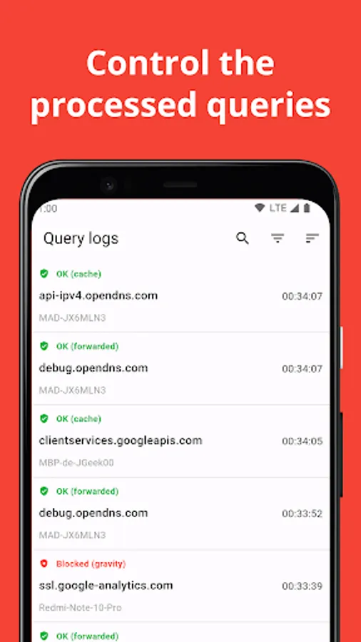 DroidHole offers a beautiful and modern user interface that follows the Material 3 guidelines. The user can see statistics, enable and disable the server, logs and more.