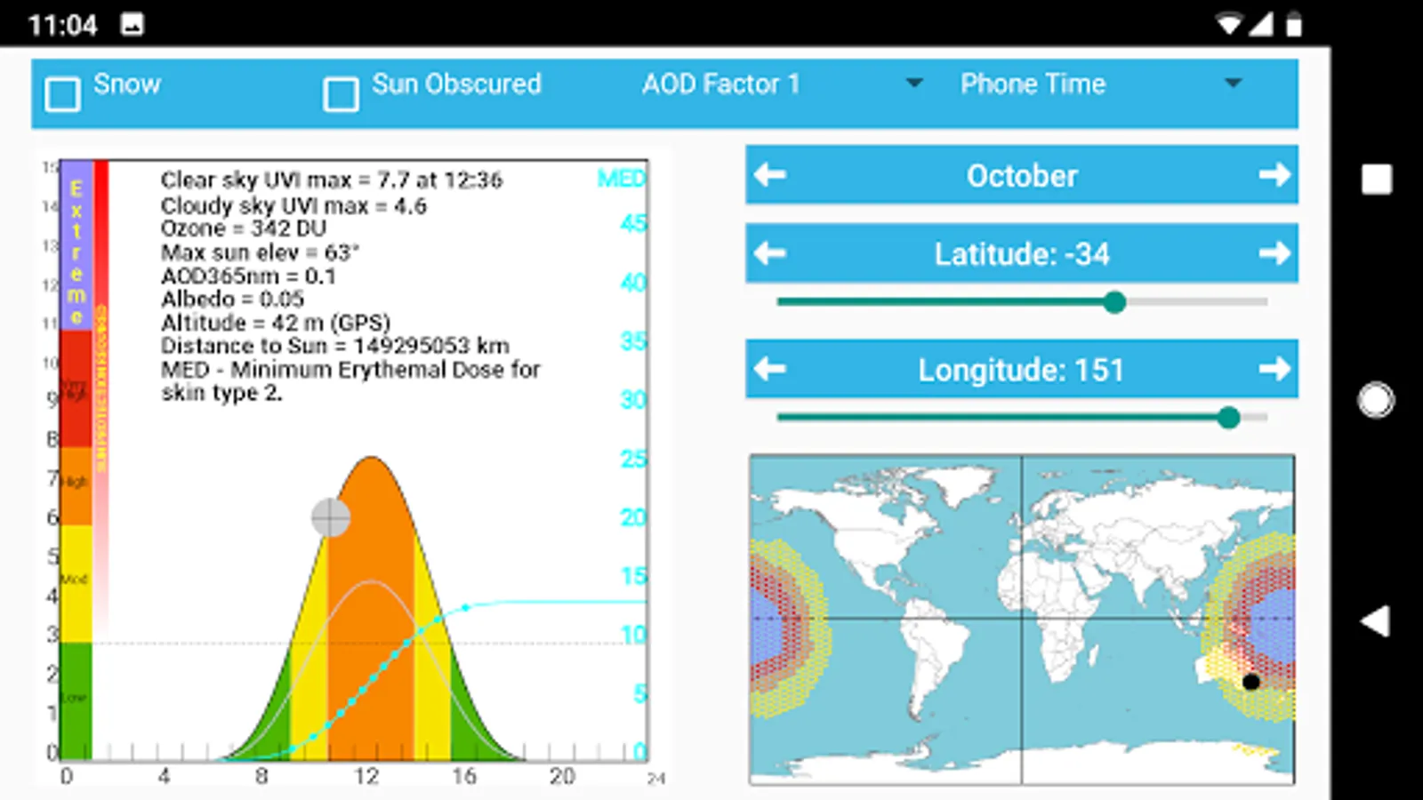 This app provides information about the current UVI and how it will vary throughout the day at any location. Sites can be selected by three methods: (1) GPS, (2) Drop-down menu of over 300 preloaded sites, (3) selection by touching the global map, using sliders to fine tune. Your own favourite locations can be specified and stored.