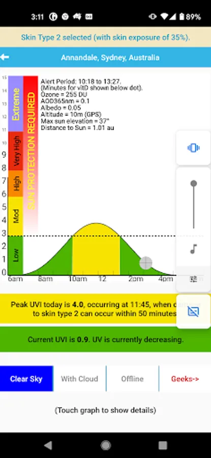 The second screen (landscape mode) goes into more detail, show plots of the progression in UVI throughout the day, with accompanying behavioural messages. The app displays parameters relevant to the calculation of UVI, and allows the capability to alter some of them to allow for local conditions, such as snow cover, heavier than usual pollution, or whether the sun is obscured by clouds.