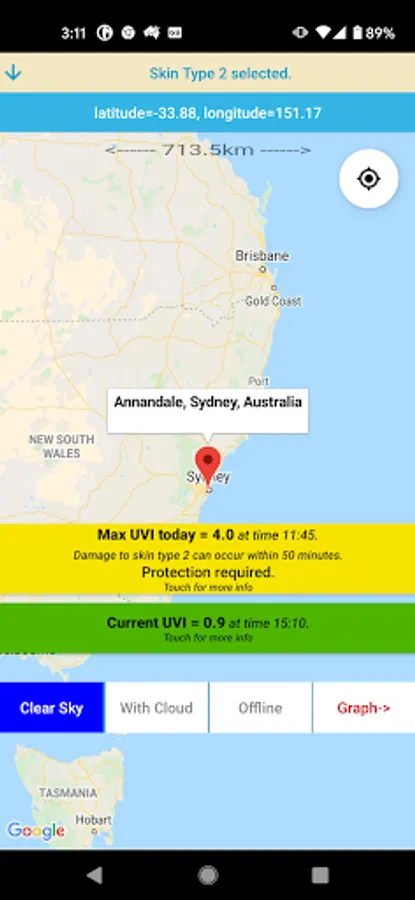 Initial outputs (portrait mode) are the calculated clear sky and UVI at the current time, and the time and value of peak UVI expected that day, along with behavioural messages that depend on the skin type entered. A world map shows the selected location and the current pattern of UVI for UVI > 3.