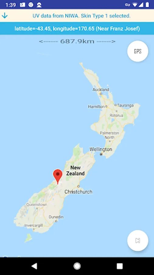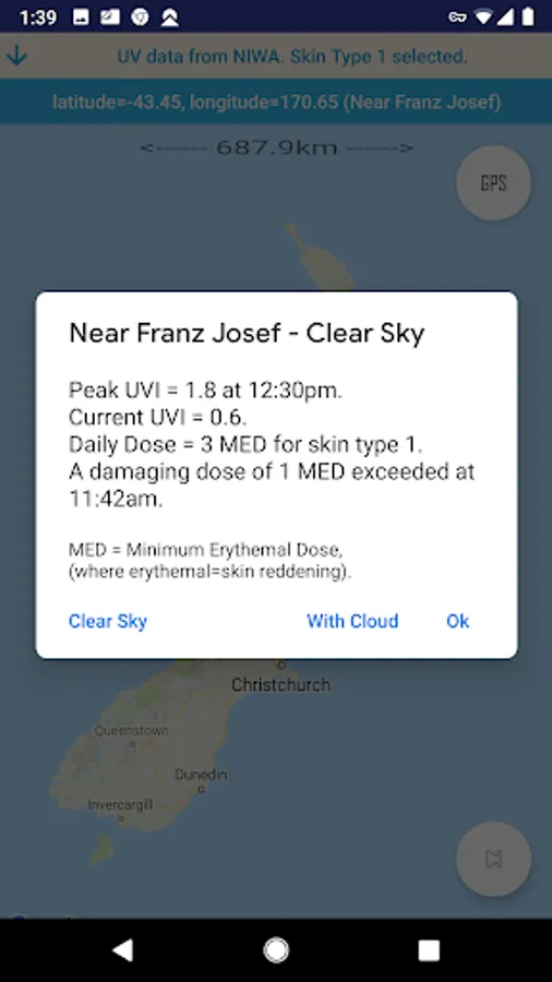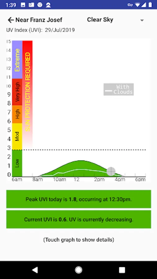 Shows UV levels at various locations throughout New Zealand. Locations can be selected via a map of New Zealand, or selecting via pre-defined locations, or by choosing one's GPS location. Skin Type is applicable so that behavioural messages relevant to individuals can be displayed. Data is provided by NIWA.