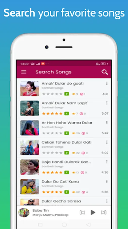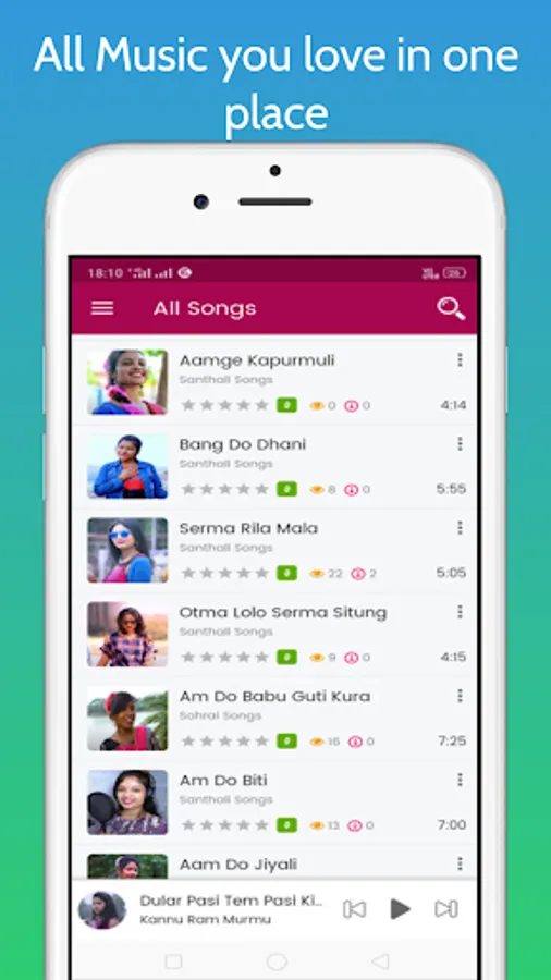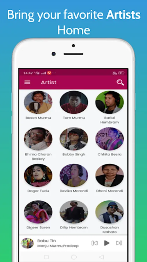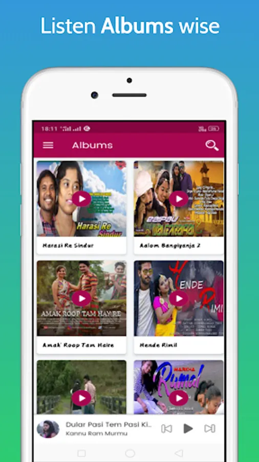Listen to songs of famous artists like Tom Murmu, Stephen Tudu, Manisha Marandi, Ashish Kr Tudu, Dinesh Tudu, Minu Soren, Ratin Kisku, Bodishwar Mariaya, Manjula Tudu, Boby Singh, Geeta Tudu, Marshal Hansda, Shyamal Marandi, Anjali Hembrom, Biren Marandi, Guddy Hembrom, Dhani Marandi,Rajesh Besra, Raju Soren, Kumar Sawan, Sushama Hembram, Dingra Boyz and many more.