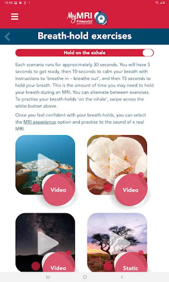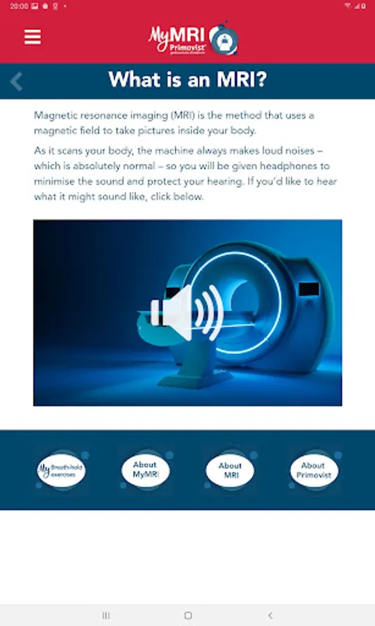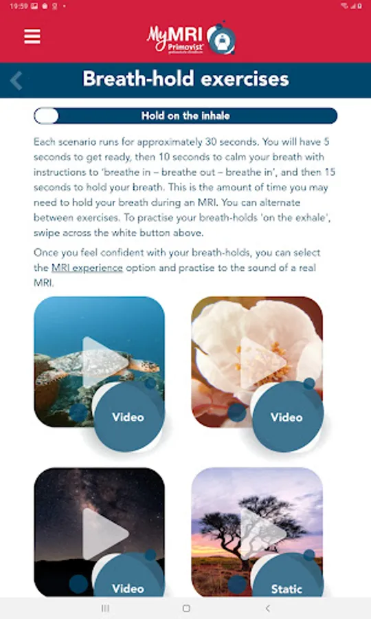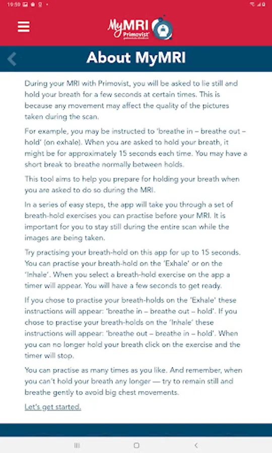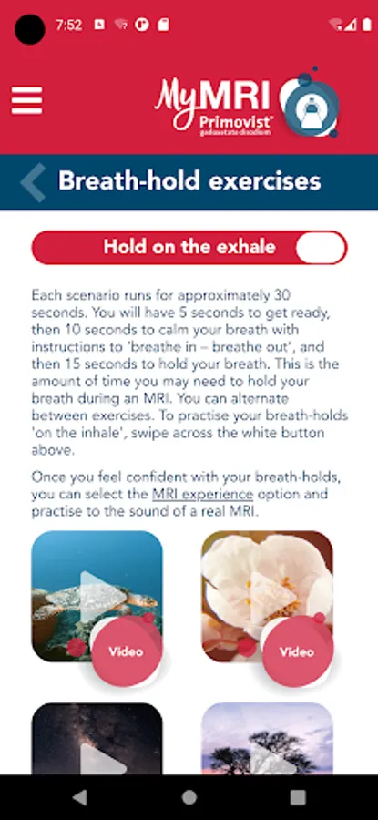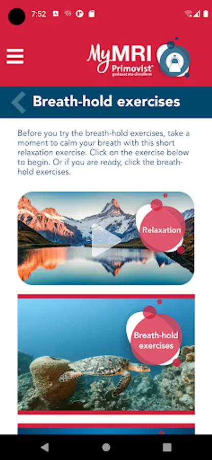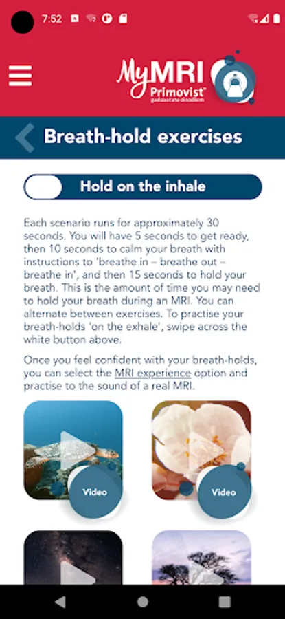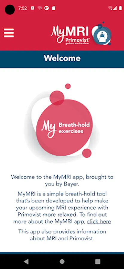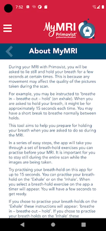 During an MRI, patients are required to hold their breath for up to 15 seconds. The app helps people prepare for their MRI by providing them with simple breath-hold exercises that last the same amount of time as their breath-holds during the MRI.