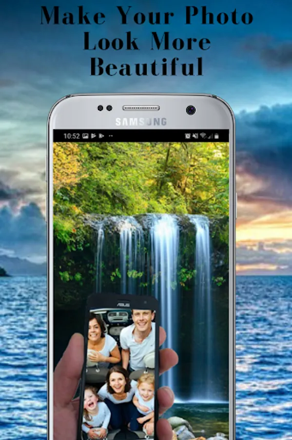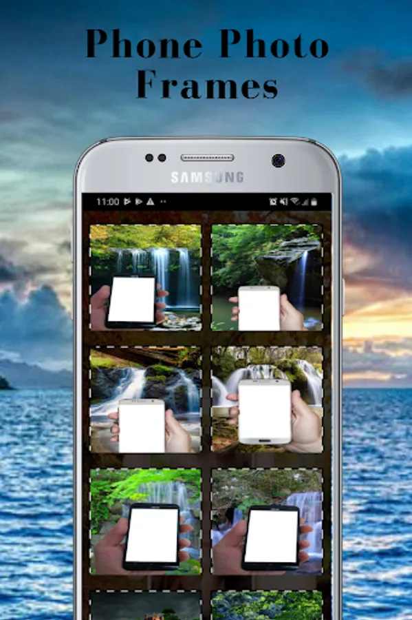 Mobile phone photo frame has four categories, a and cell phone frames with waterfalls, cell phone frames with sea images, flower frames, landscape frames and very beautiful. In addition With Mobile phone photo frame you can add beautiful images of your loved ones and easily share them with friends.