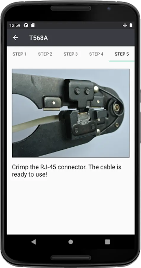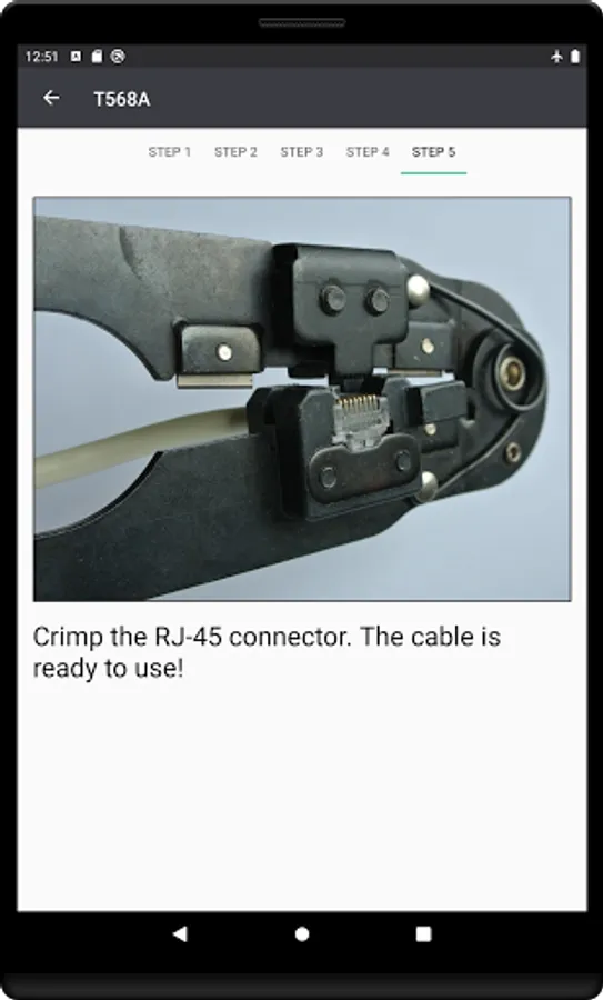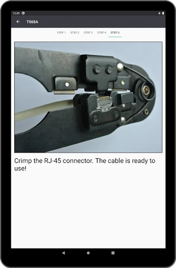 The UTP Cable (RJ45) app shows the two different wire schemes in use for UTP cables. Those T568A and T568B color schemes are displayed in very clear pictures to understand the difference. Also the different UTP cable types, straight and crossover cables, are shown. The usage of both UTP cable types are explained in an easy to understand table. The Do It Yourself part of the app explains clearly in five steps how to crimp the connector in the correct way on a UTP cable.