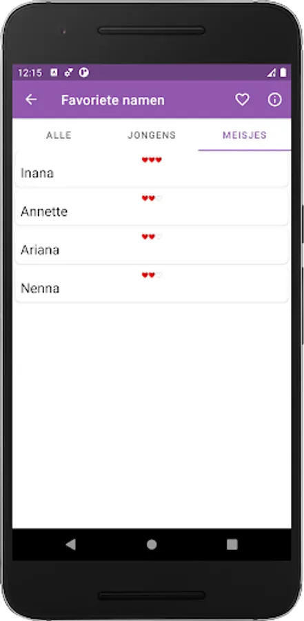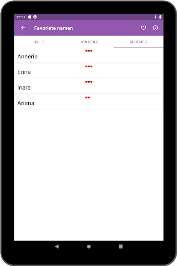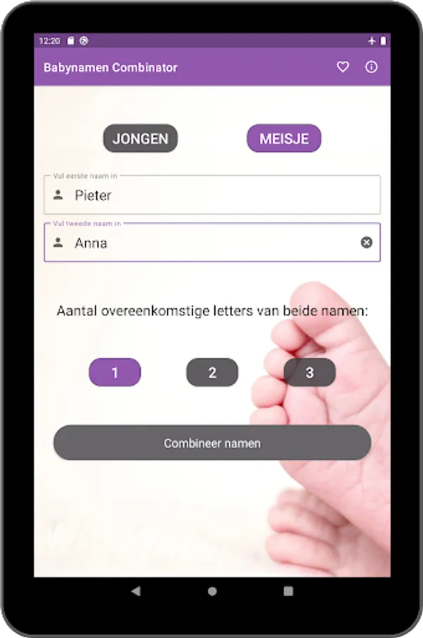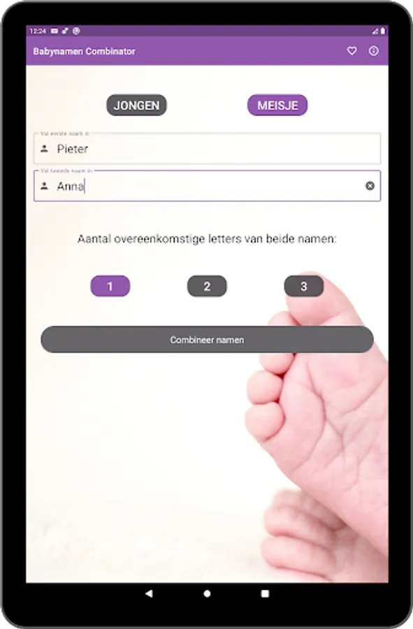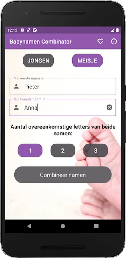 The application will generate the possible baby names from a file with more than 20,000 male and female names. All these names are given in recent years to Dutch children. Hopefully you will find a nice name for your baby.