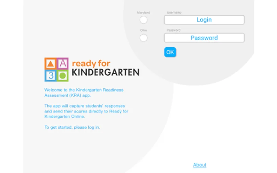 The Ready for Kindergarten: KRA app allows teachers to administer a subset of items to kindergarten students in those states that are administering the KRA. Scores are fed directly into the KReady system where they will provide information to teachers as well as school and district leaders about what children are able to do as they transition into kindergarten. The KRA was developed by a consortium including the Maryland State Department of Education, the Ohio Department of Education, the Johns Hopkins University Center for Technology in Education, and WestEd.