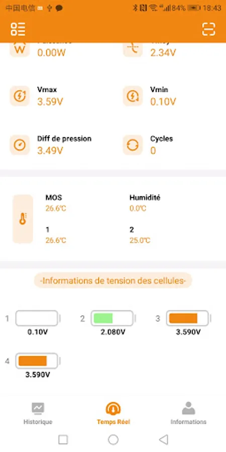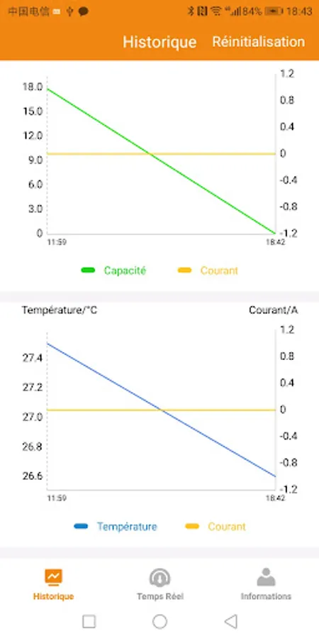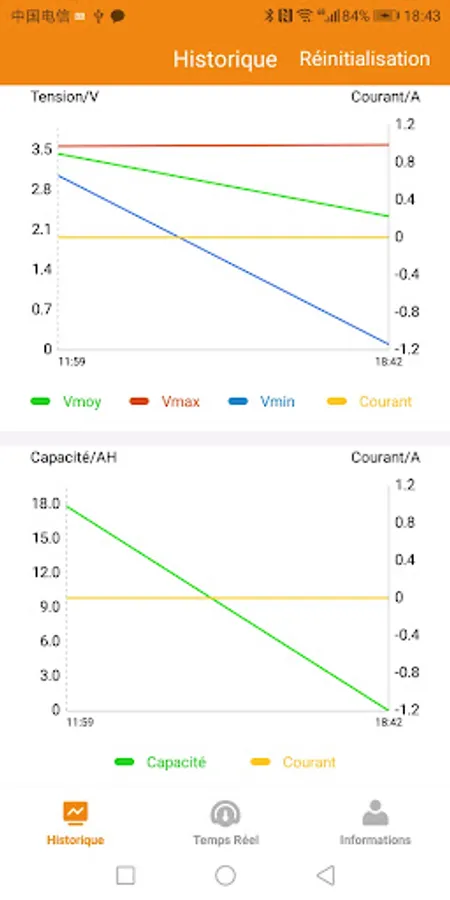 4) Find the history of the last days concerning variations in voltage, capacity or temperature via the "History" tab