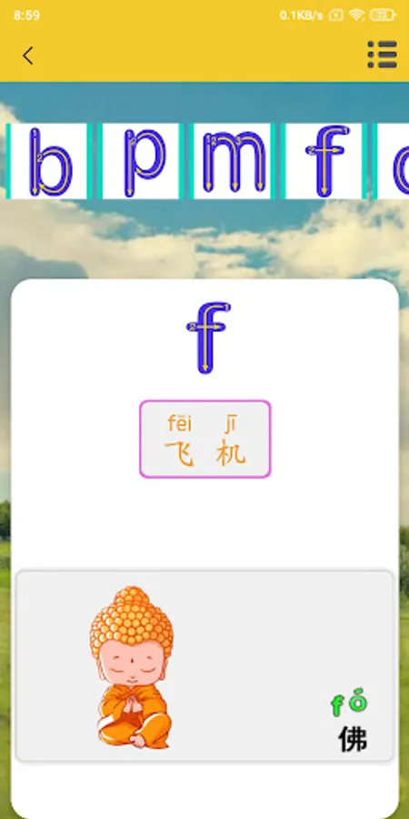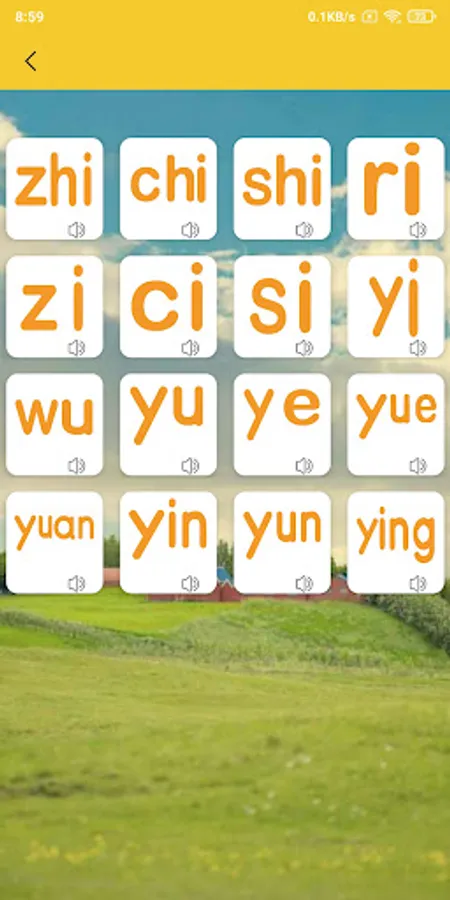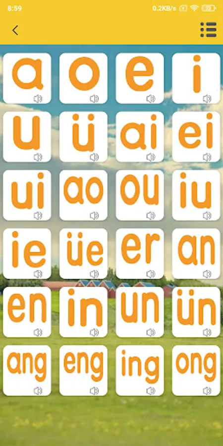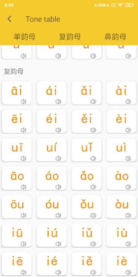 2: Final mode: Provide 24 finals icons, stroke order of finals, finals word examples, and sentence examples. And there is a standard voice recitation accordingly.