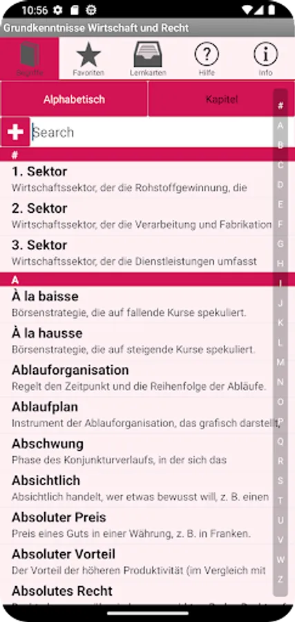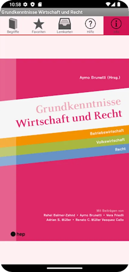 This app is based on the two learning materials "Basic Knowledge of Business and Law" (Volume 1) and "Advanced Knowledge of Business and Law" (Volume 2) by Aymo Brunetti, Rahel Balmer-Zahnd, Vera Friedli, Adrian S. Müller and Renato C. Müller Vasquez Callo from the hep publishing house. It contains the most important keywords from both books - arranged alphabetically and by chapter.
