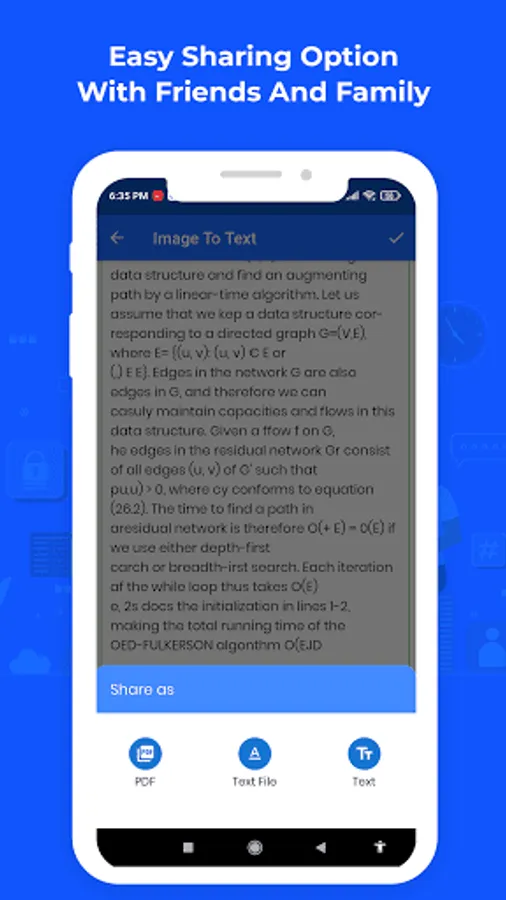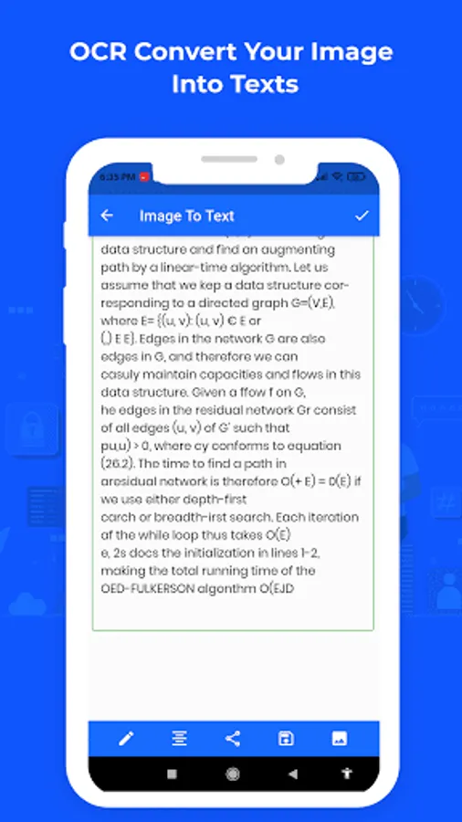 Extract text from the image: OCR(Optical Character Recognition) features extract text from your documents and editing, sharing, and saving for letters in PDF, Text-file, and Raw-text.