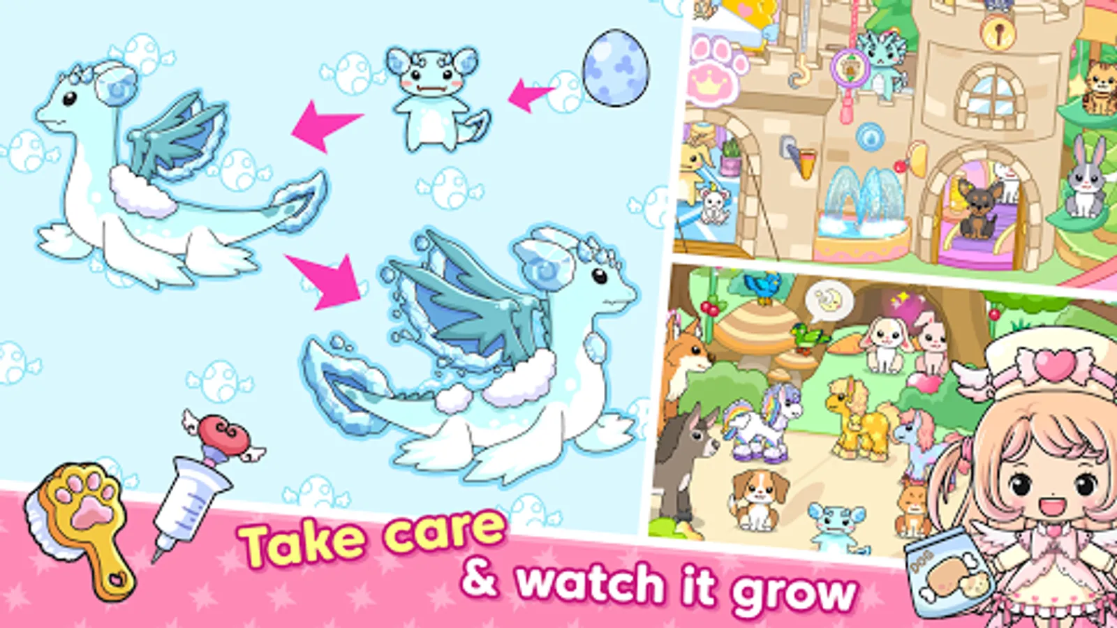 - More than 100 animal characters for you to raise and take care of such as little unicorn, little fairy, mischievous cat, cute dog.