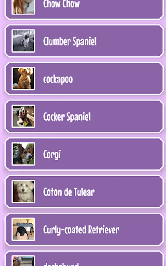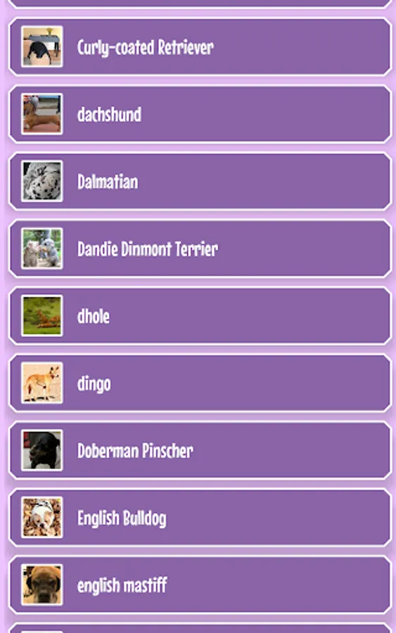 The game includes virtually every known dog breed including visla, pitfall, airedale, spanish waterdog, beagle, pug, dachshund, scottish terrier, kelpie, rottweiler, groenedael, Japanese spaniel, dobermann, whippet, dalmatian, french bulldog, golden retriever, corgi, dhole, border collie, American terrier, chihuahua, toy terrier and lots more!