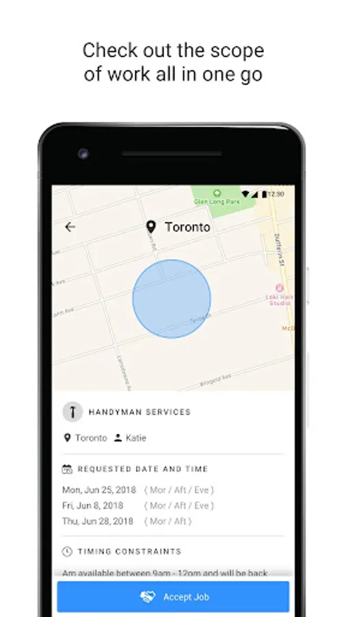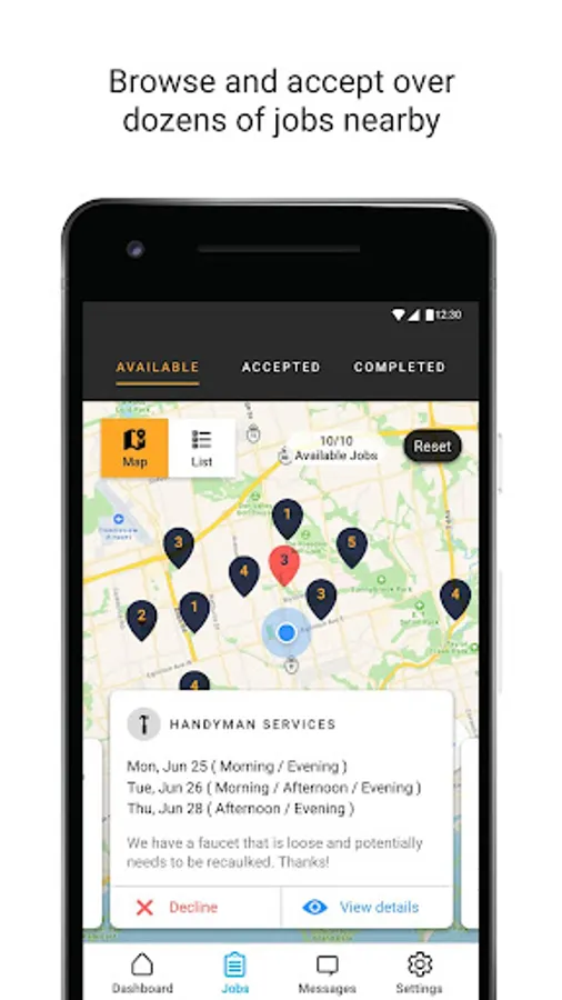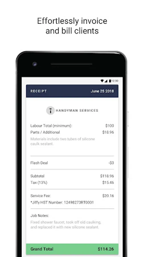 With the Jiffy for Pros app, we've given professionals an easy way to accept and manage their Jiffy jobs while on the road. You can easily see which jobs are available nearby and if it's something you can fulfil, the job is yours! You can also bill out the job on the spot while all the details are still fresh in your mind, and get a receipt before you even leave the appointment.