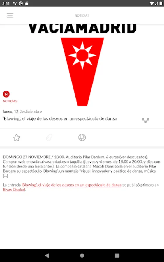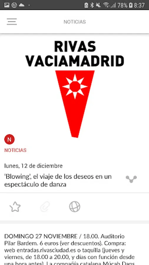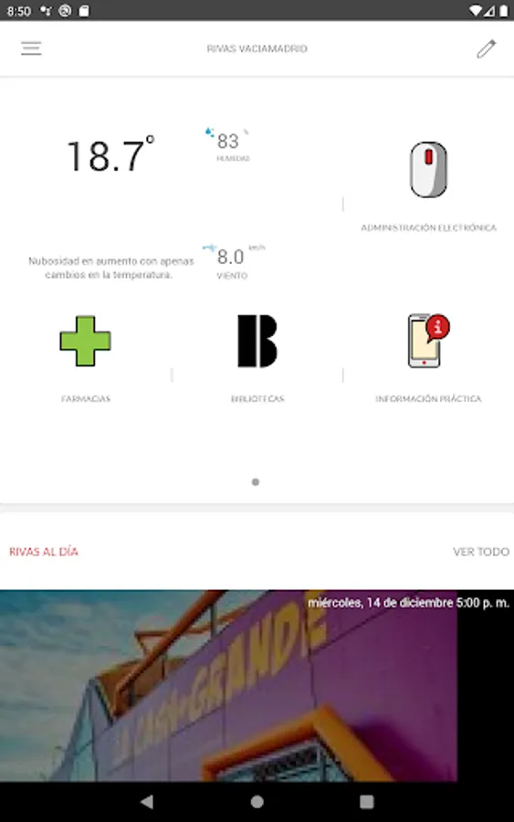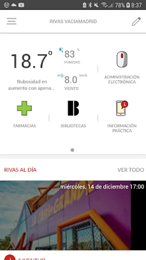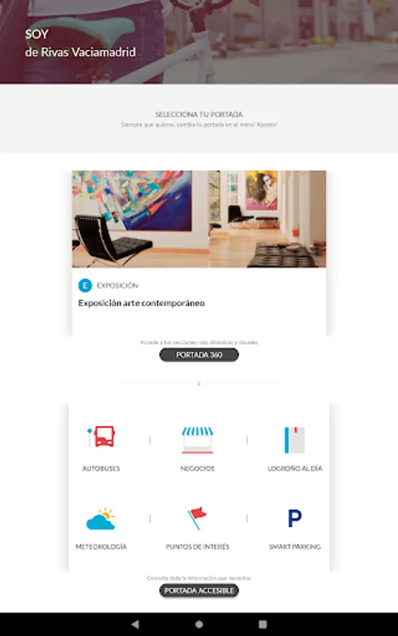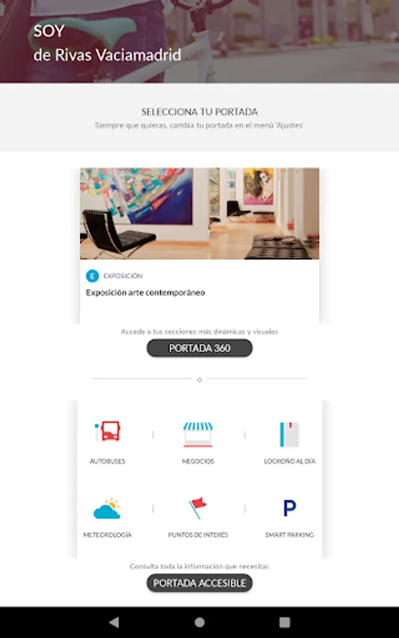 Rivas Ciudad is the official application of the Rivas Vaciamadrid City Council through which you can keep up to date with everything that happens in our city. You will totally make this application yours. You can choose, according to your interests, between the Live in Rivas mode or the tourist mode in order to find useful and updated information on Todoenrivas.es. You will also have the option of choosing your own cover: '360 Cover' will be visual and with continuous content updates and 'Accessible Cover' illustrated with icons of all the useful sections for you.