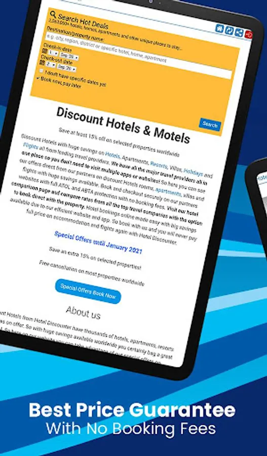 Our discount hotel finder app is lightweight in device memory and easy to use helping you grab a fantastic deal. With free cancellation on selected properties you can have complete peace of mind should circumstances change. Furthermore all of our travel partners offer full ATOL and ABTA protection when you checkout securely on their website for full protection.