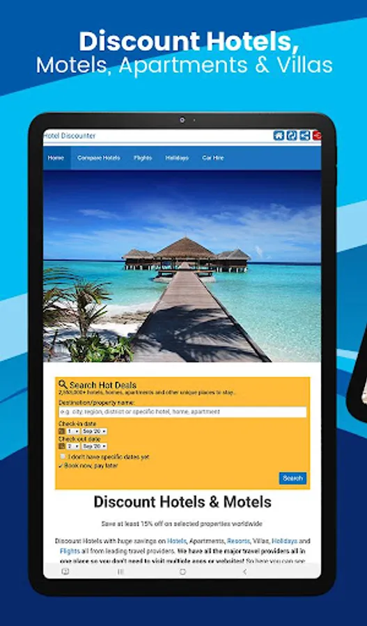 Our hotel booking app will find you the best discount hotels, motels, apartments and villas from leading travel providers. To make it even more easier for you, here on our travel saving hotel deals app we have incredible accommodation deals, car hire, flights and holidays all in one place! Our search has over 5 million properties worldwide and thousands of reviews to help you make the right choice.