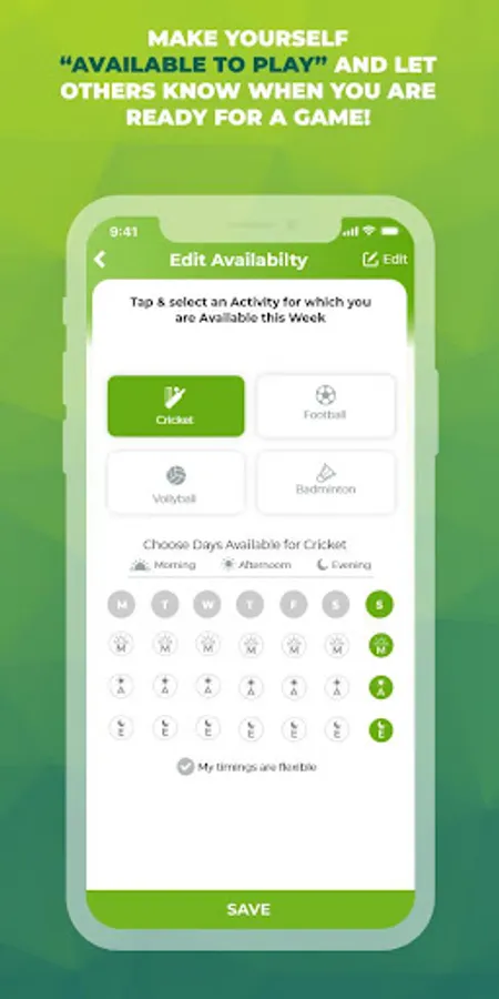 - Make yourself ‘Available to Play’ for the desired sport at the desired time. Find players or get discovered by other players matching your availability.