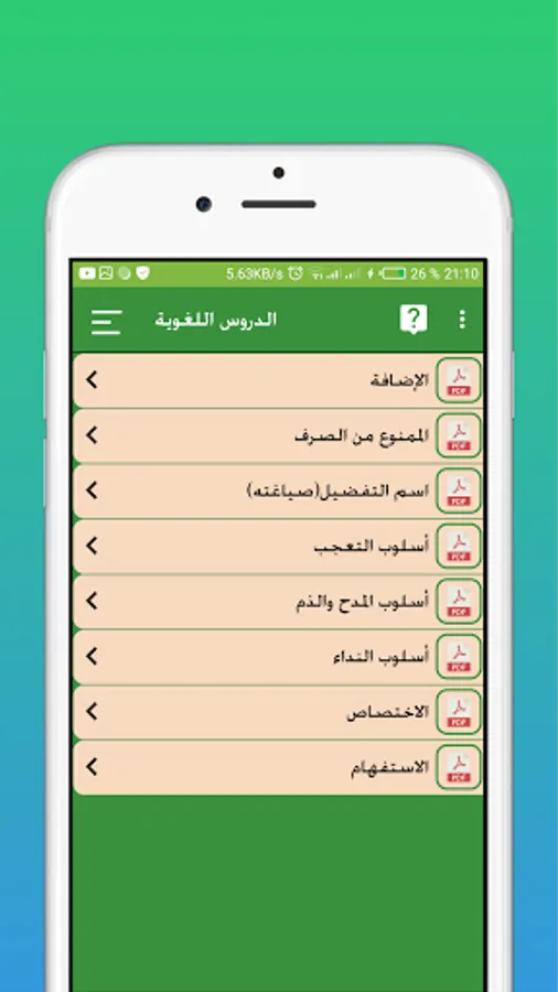 The application contains several sections: The first section contains all the Arabic language lessons for the third level of preparatory school.