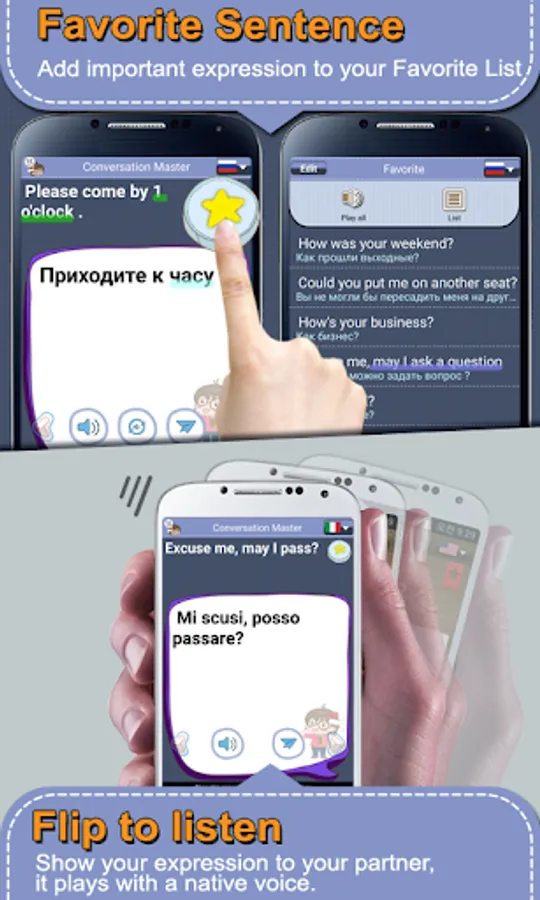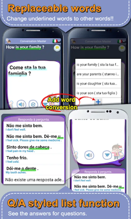 This is a useful language learning app(English,Korean,Japanese,Chinese,French,German,Spanish,Thai,Indonesian,Vietnamese,Arabic,Russian,Italian,Portuguese) with various situational QnA styled expressions for daily conversation.