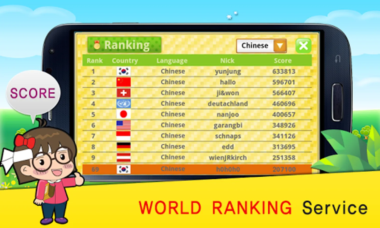 - Support the World Ranking List for each language, so you can check how high your ranking is among the people around world. Let’s challenge to be the NO 1 in all languages.