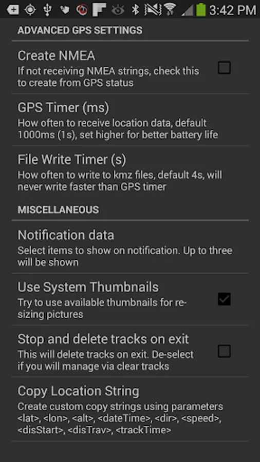 Share GPS contains other features as well. The app keeps a constant notification up, which can be customized to include any of the status items, allowing for viewing on the lock screen for some mobiles. The notification is also used to indicate Share GPS is running, even when in the background. In addition, the copy location to clipboard is customizable, allowing the user to have a custom string that includes the location, for example, to create a URL for a website.