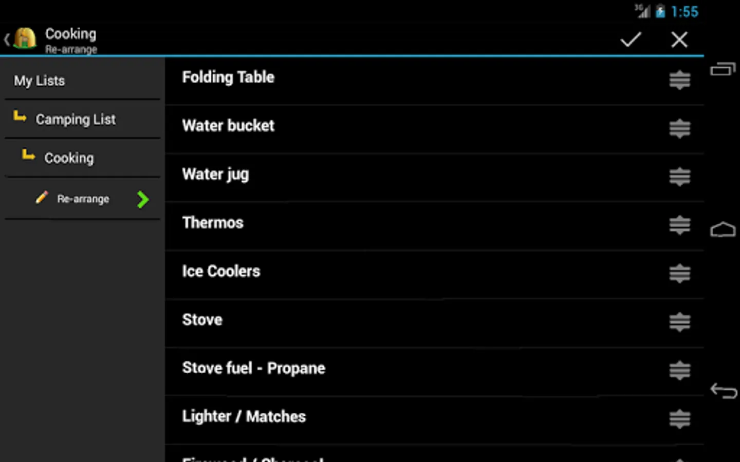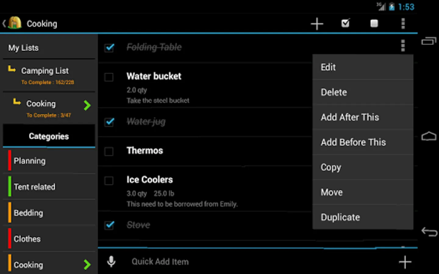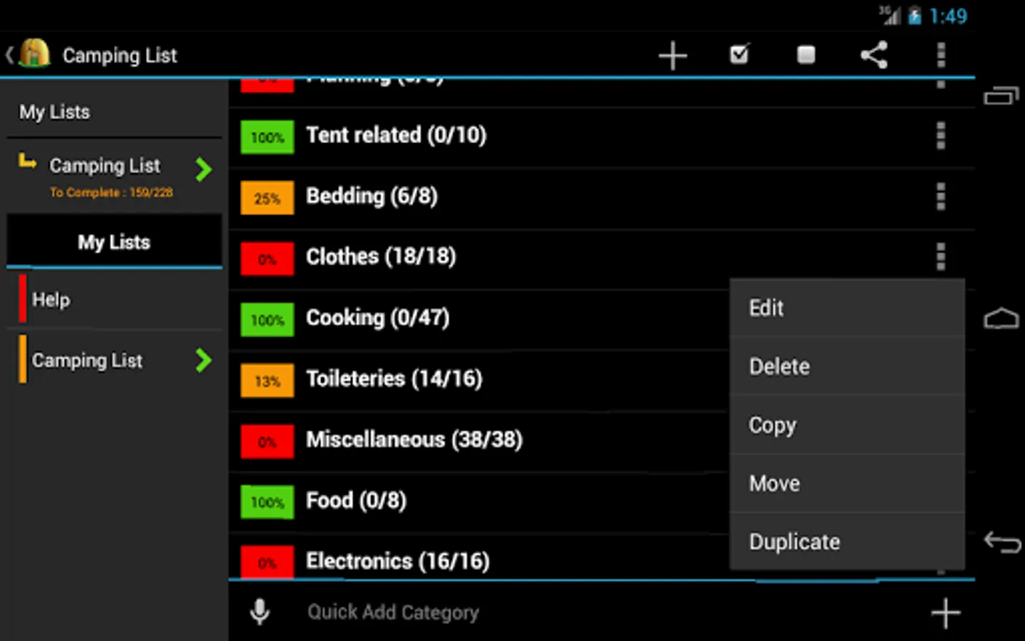 With options to add/edit/delete/copy/move/rearrange/auto sort and duplicate you can quickly customize the list anyway you want. With support for multiple lists - feel free to create lists for various types of camping trips - short trips / long trips etc.