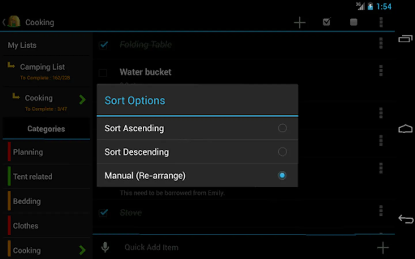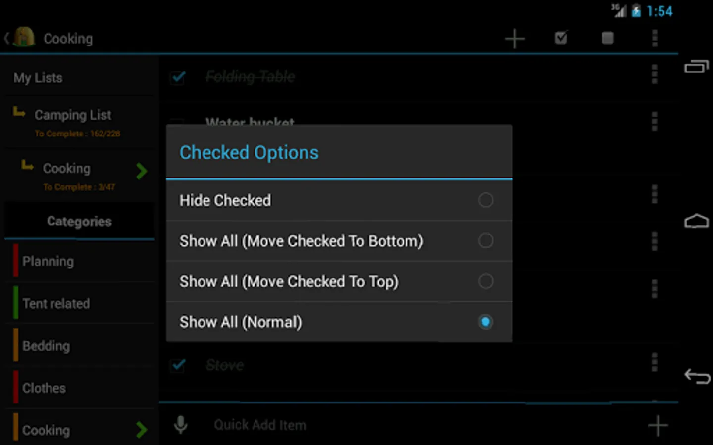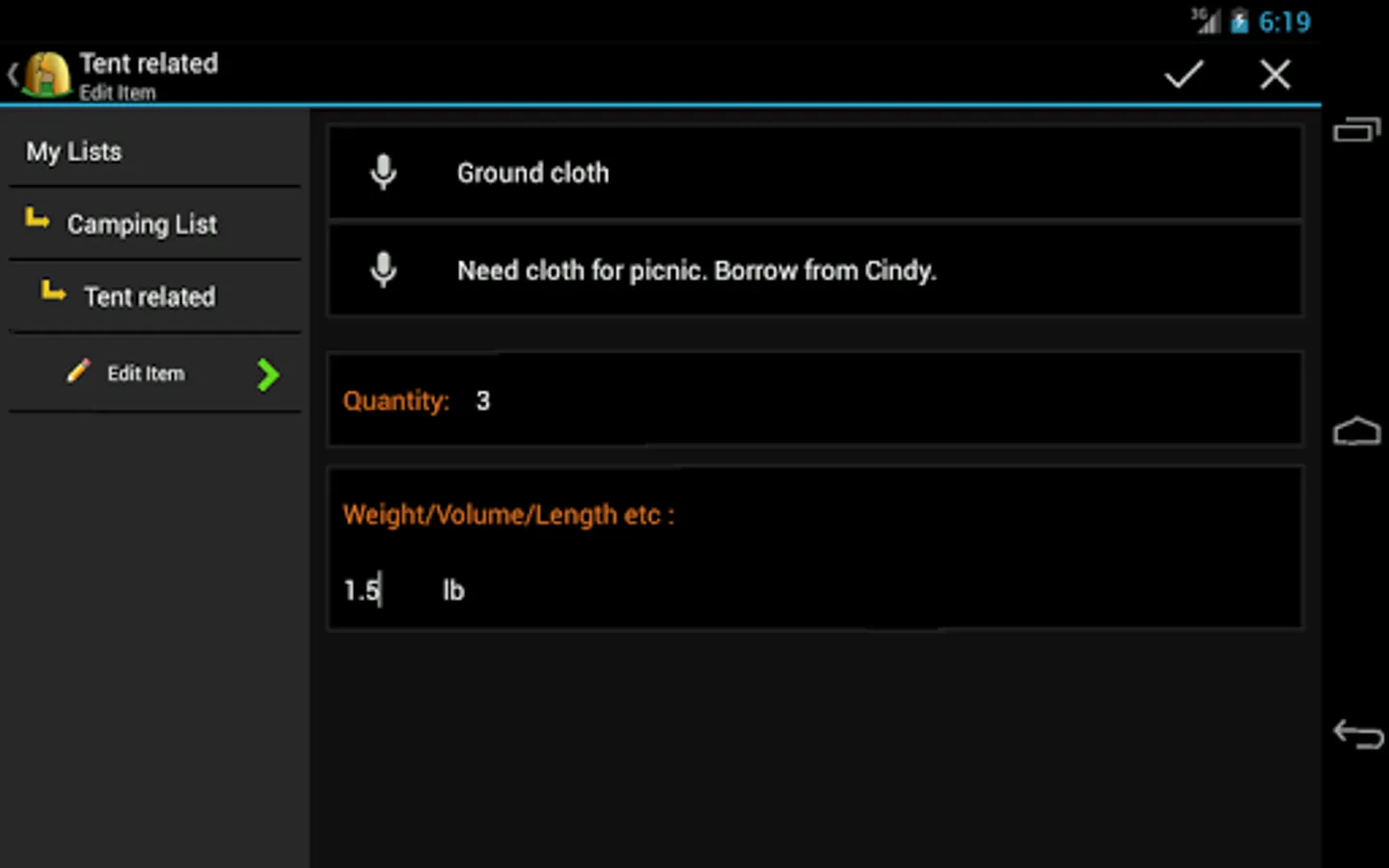 With options to add/edit/delete/copy/move/rearrange/auto sort and duplicate you can quickly customize the list anyway you want. With support for multiple lists - feel free to create lists for various types of camping trips - short trips / long trips etc.