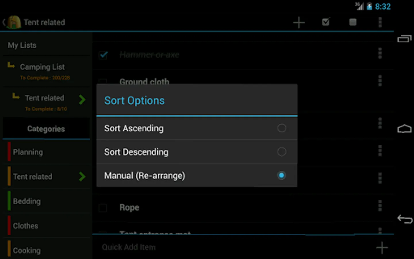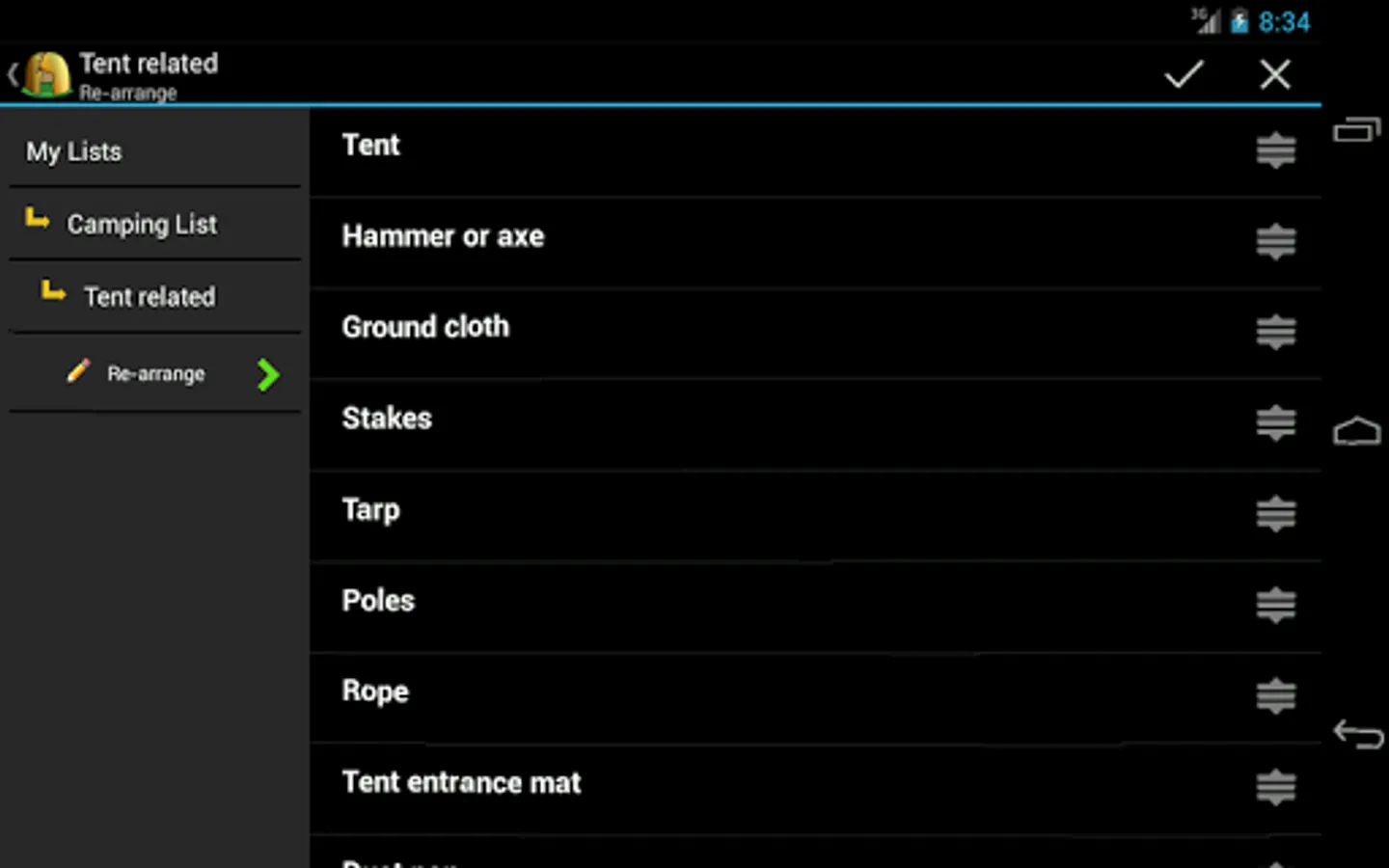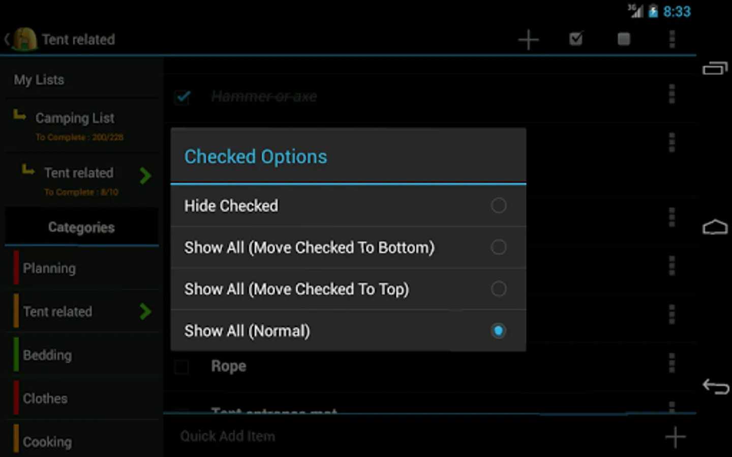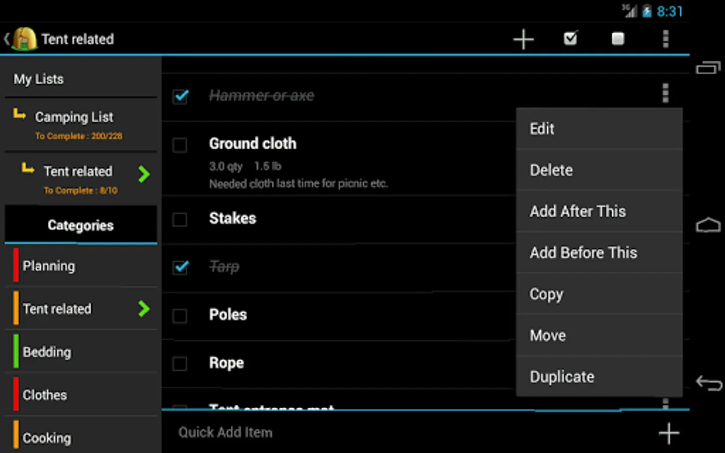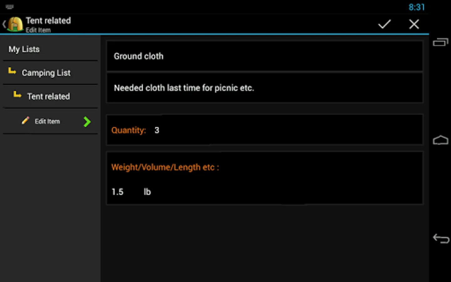 Planning a camping trip ? Pre-loaded with more than 225 camping trip related items, this app is all you need to ensure you don't forget anything for your trip. Save hours of typing or creating lists of things to do before your camping trip. Avoid expensive mistakes and be stress free. This app has options to hide/unhide/check all/uncheck all--so you can keep re-using the list for every camping travel. Want to share your list with friends or family? No Problem. Just e-mail them your list.