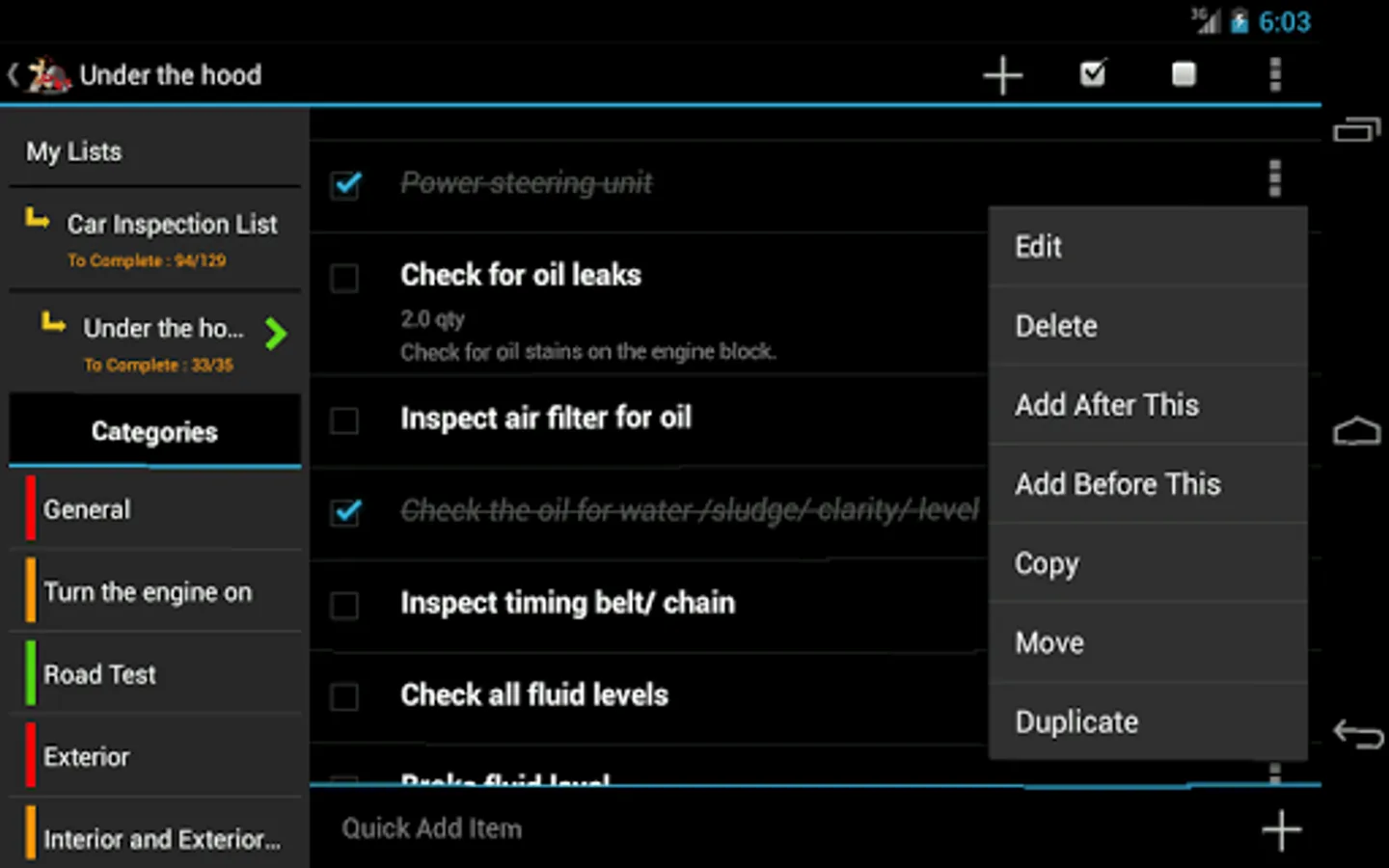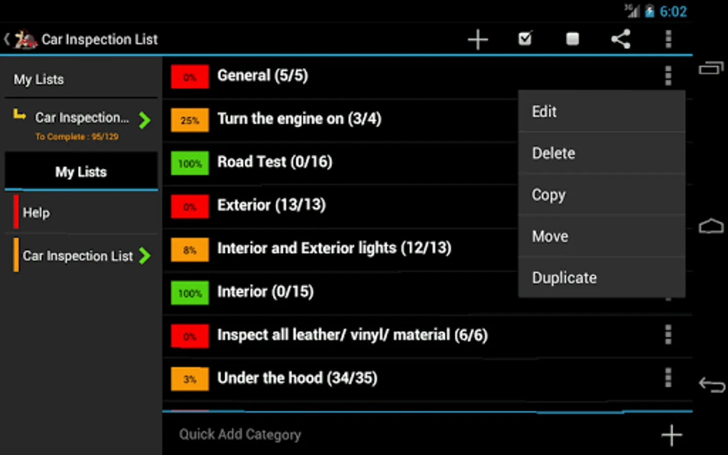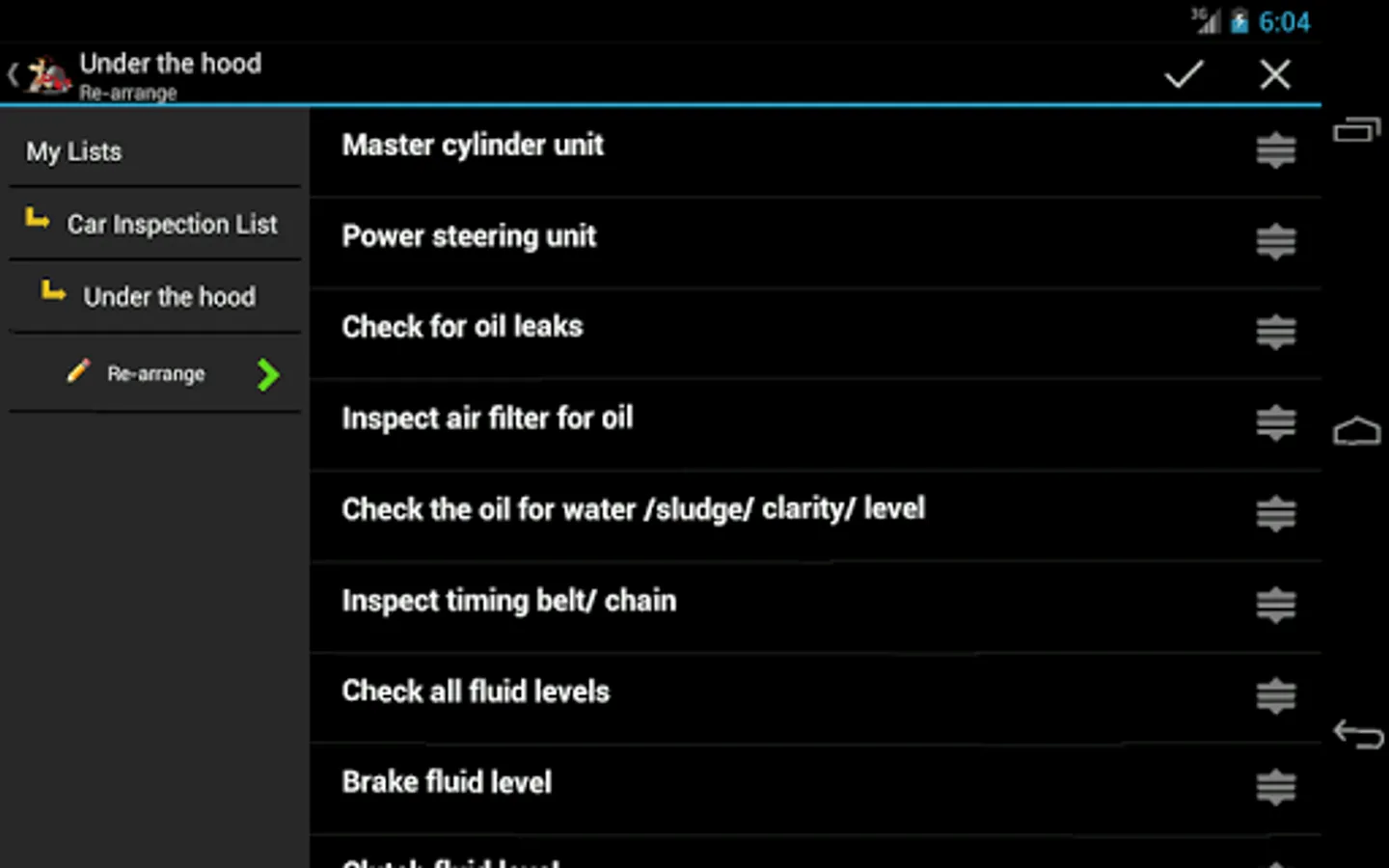 Are you looking to buy an used car ? Make sure you inspect the car thoroughly before you make the payment. This used Car / auto Inspection checklist comes pre-populated with over 125 inspection items that you can check before making the purchase. Avoid expensive mistakes. Use this checklist and be stress free. The inspection list is configurable and easy to use with thumb friendly check/ uncheck options.