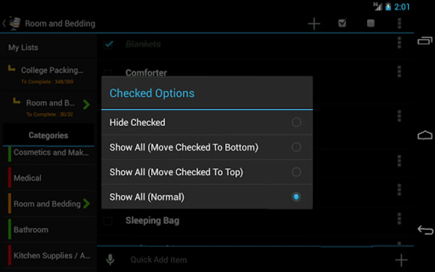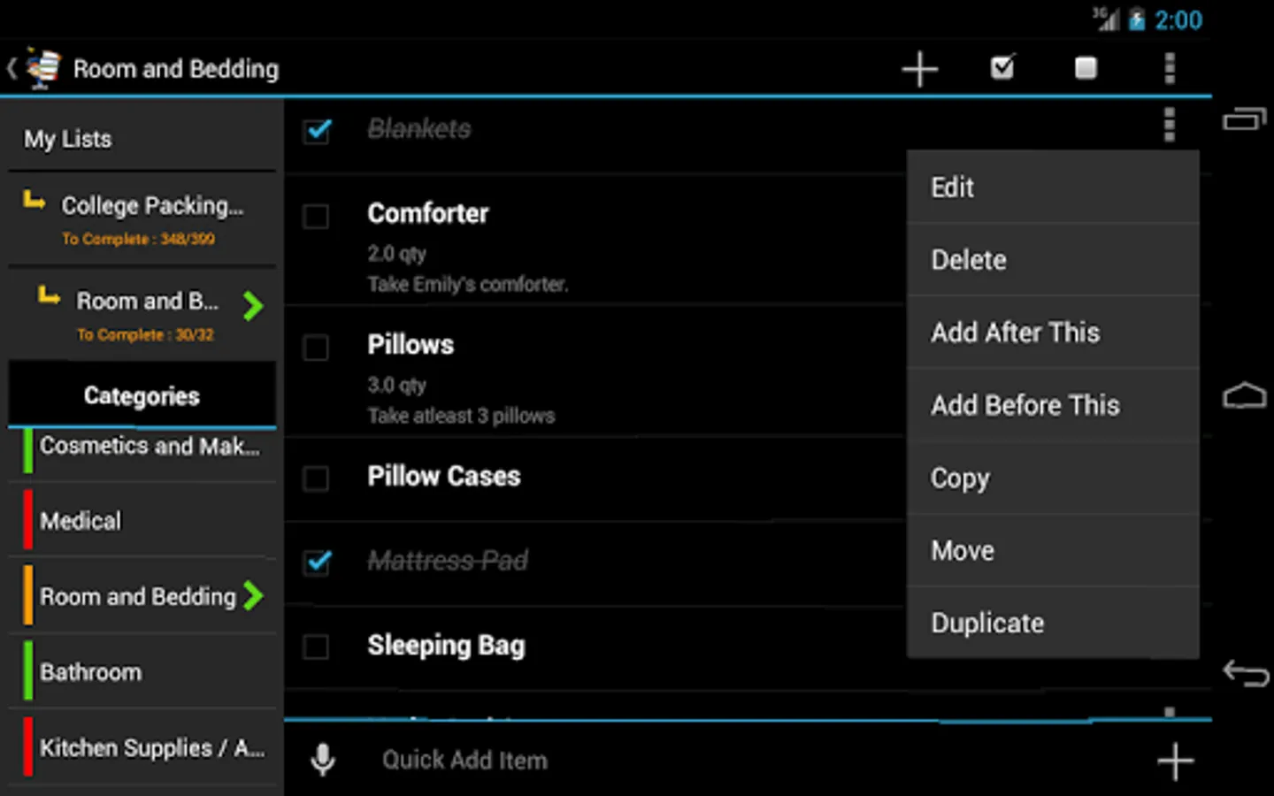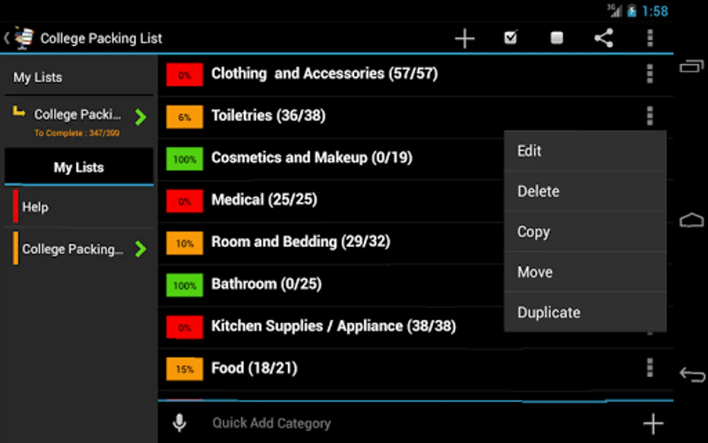 Are you packing for college? Packing for college is always stressful. There is the clothes you need to pack, toiletries, cosmetics and lot more. With this college packing or moving checklist app you never have to worry about forgetting anything. This college list app comes with everything needed to prepare for college. It comes pre-populated with around 400 items. This checklist is all you need to ensure you don't forget anything.