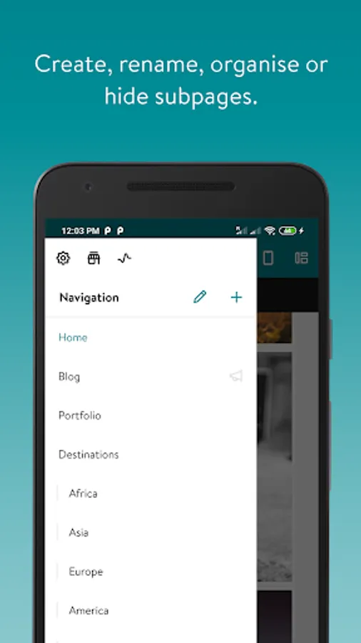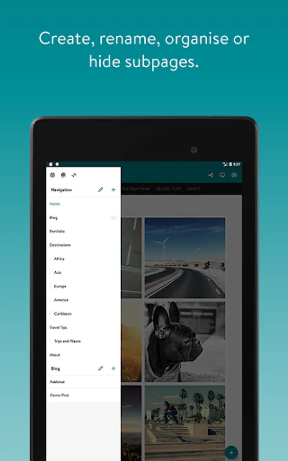 Edit your site’s navigation and create new pages. You can also hide, rename, rearrange, and delete pages within the app.