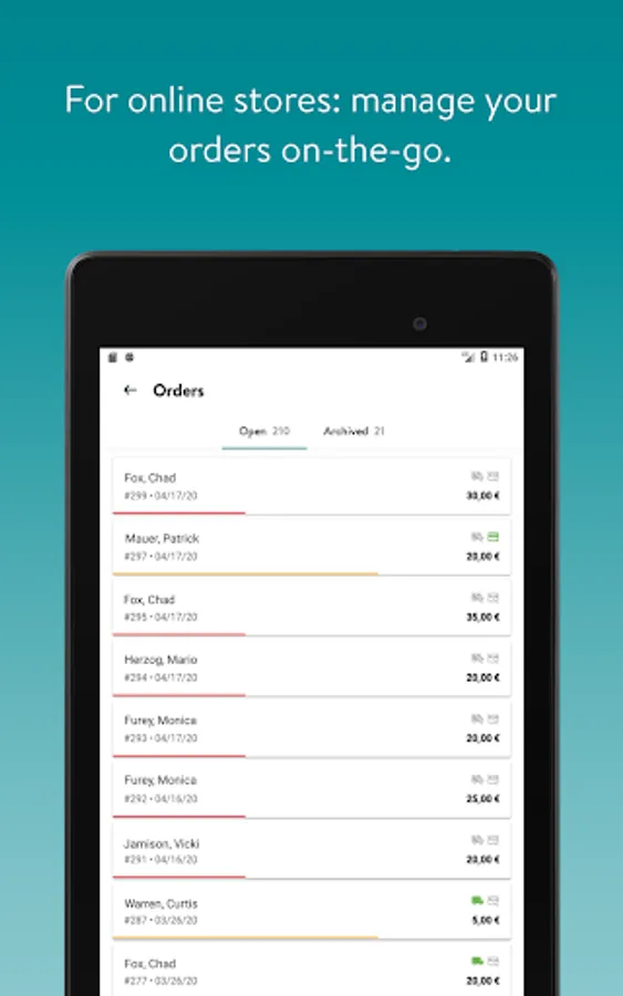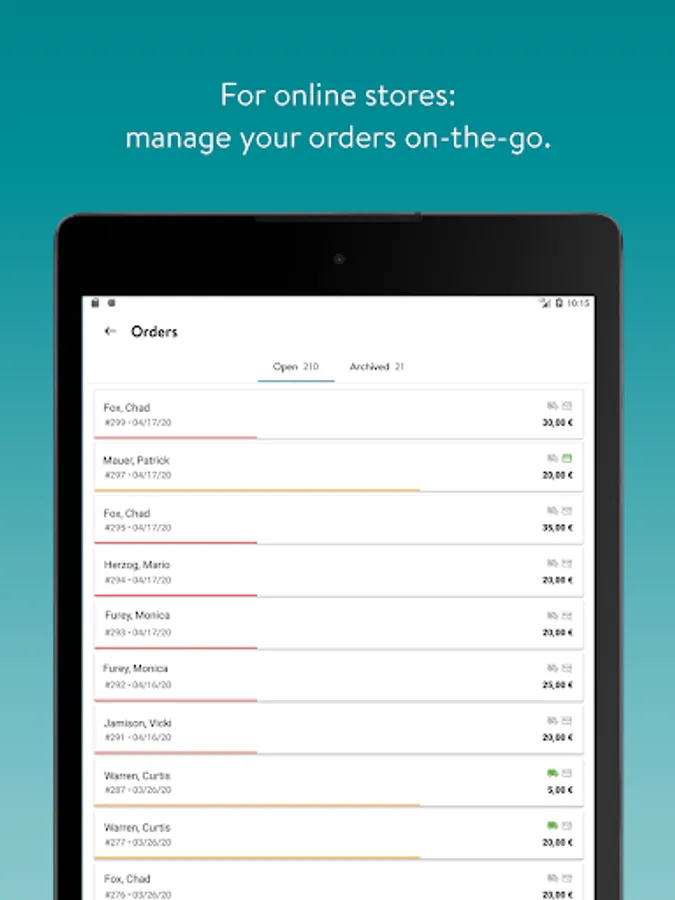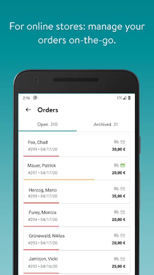 View the list of orders and order archives. Mark orders as paid / delivered, add notes, and keep up-to-date with new orders via push notifications.