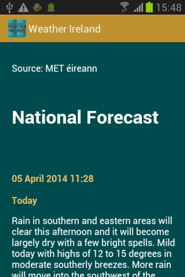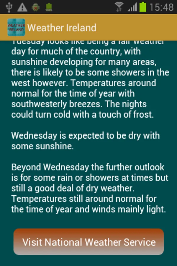 One click and four seconds later you are presented with a five day forecast for Ireland. Within the app you can also click to visit the official website of Met Éireann to get further weather information.