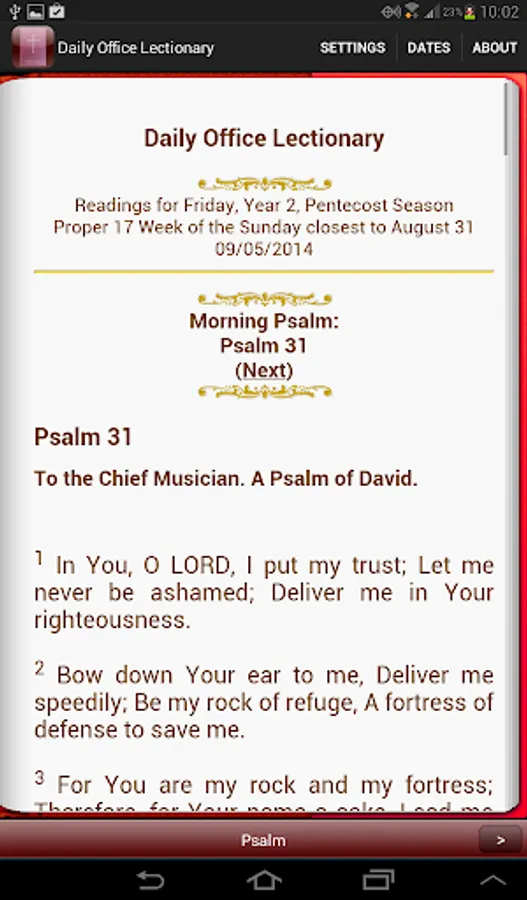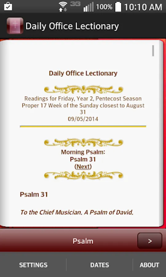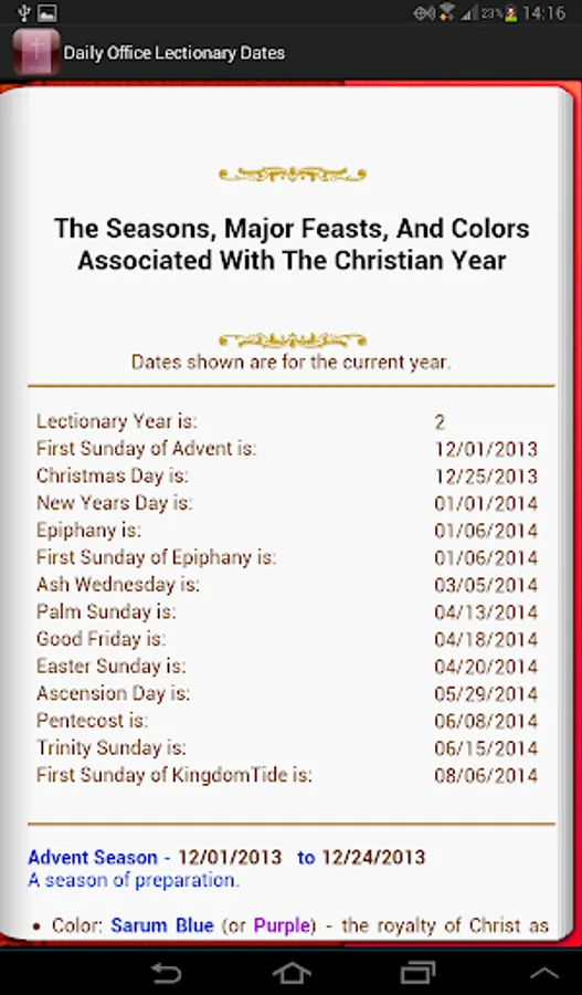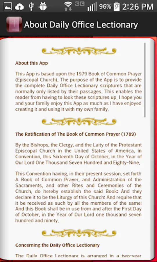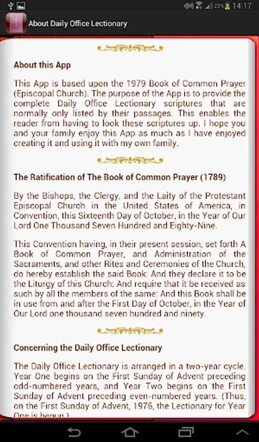 The purpose of this App is to provide the complete Daily Office Lectionary scriptures that are normally only listed by their passages. This enables the reader from having to look these scriptures up. I hope you and your family enjoy this App as much as I have enjoyed creating it for use with my own family.