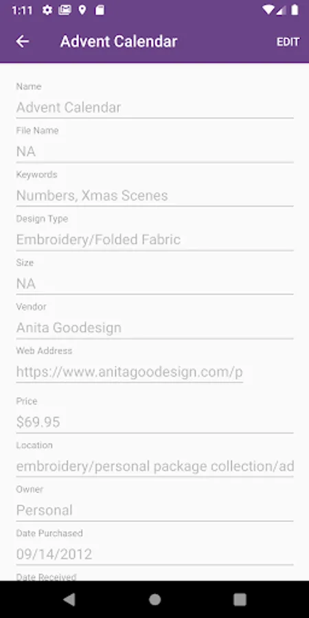 Embroidery Inventory is a cataloging program that will help you keep track of your embroidery designs. A search feature allows you to search your designs by name, vendor, or keywords. Data fields are also provided to help you remember where you stored your design plus more.