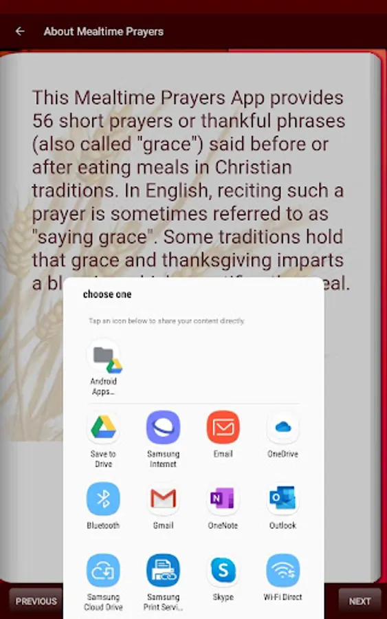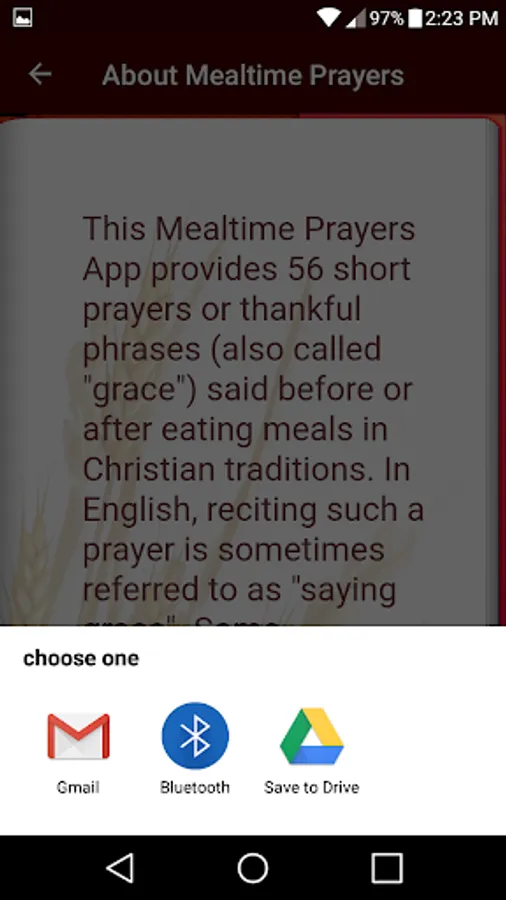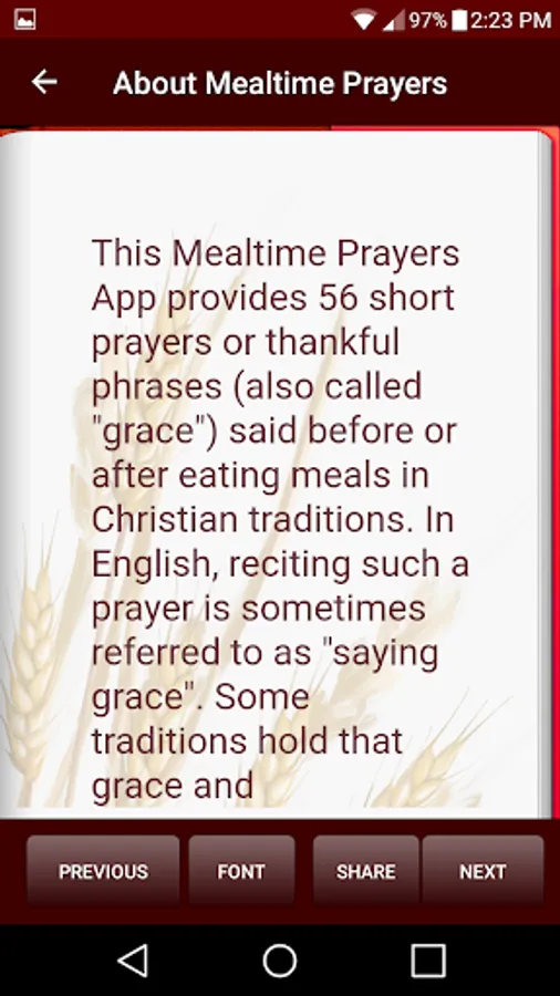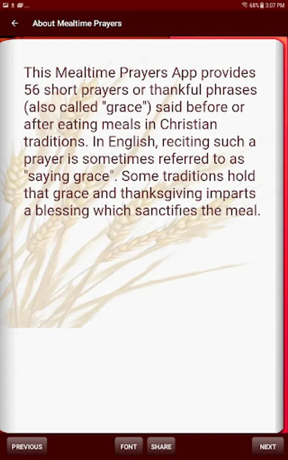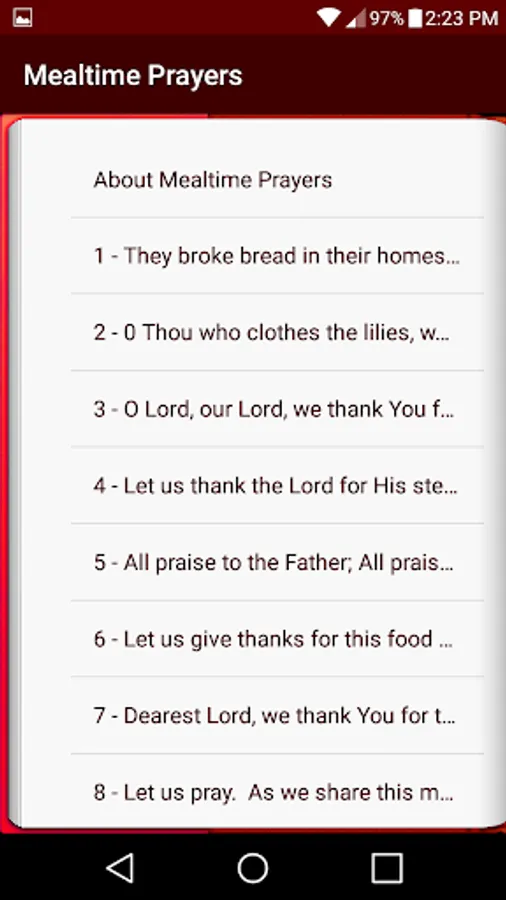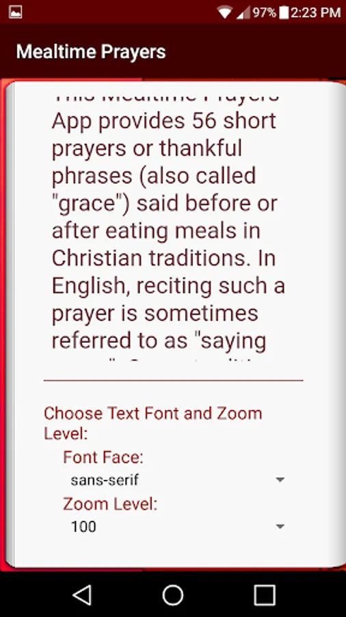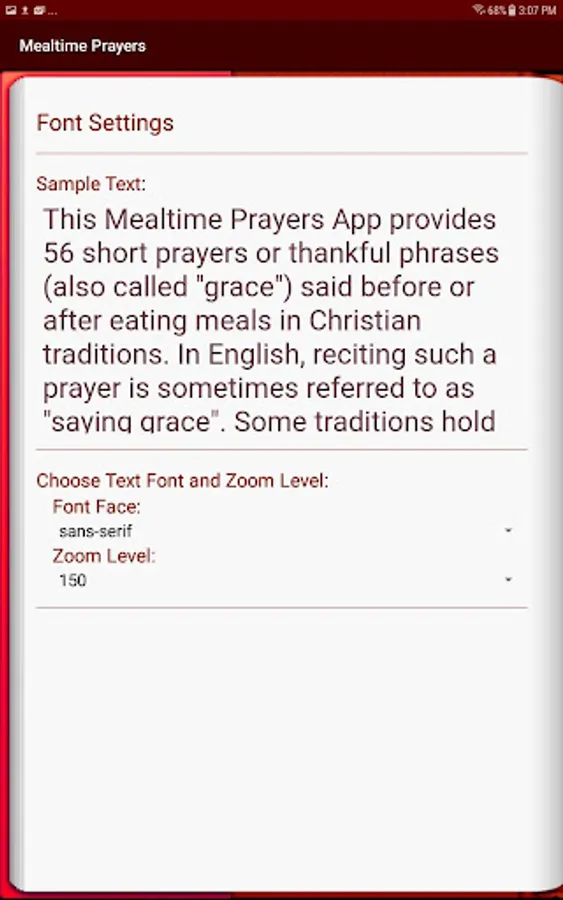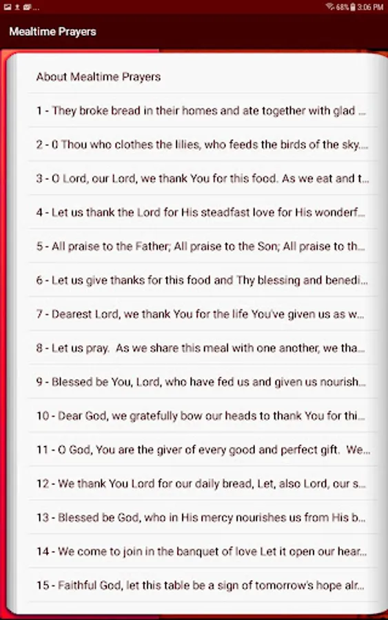 This app provides 56 short prayers or thankful phrases (also called "grace") said before or after eating meals in Christian traditions. In English, reciting such a prayer is sometimes referred to as "saying grace". Some traditions hold that grace and thanksgiving imparts a blessing which sanctifies the meal.