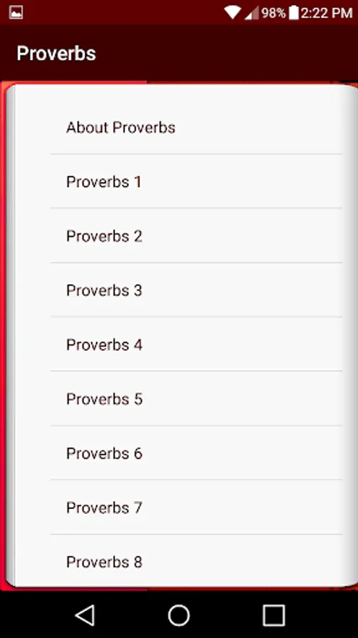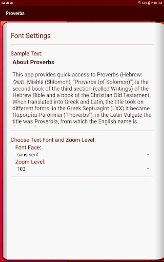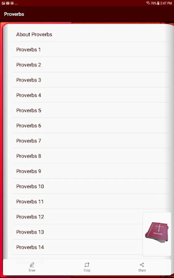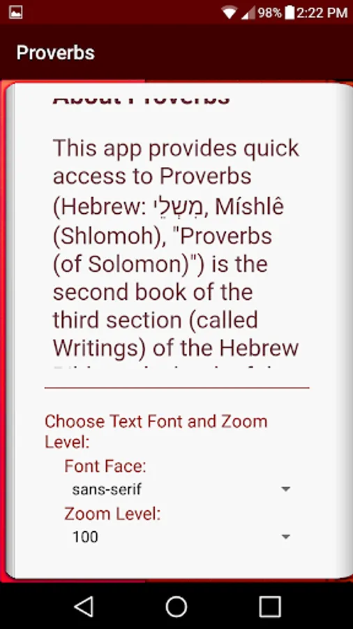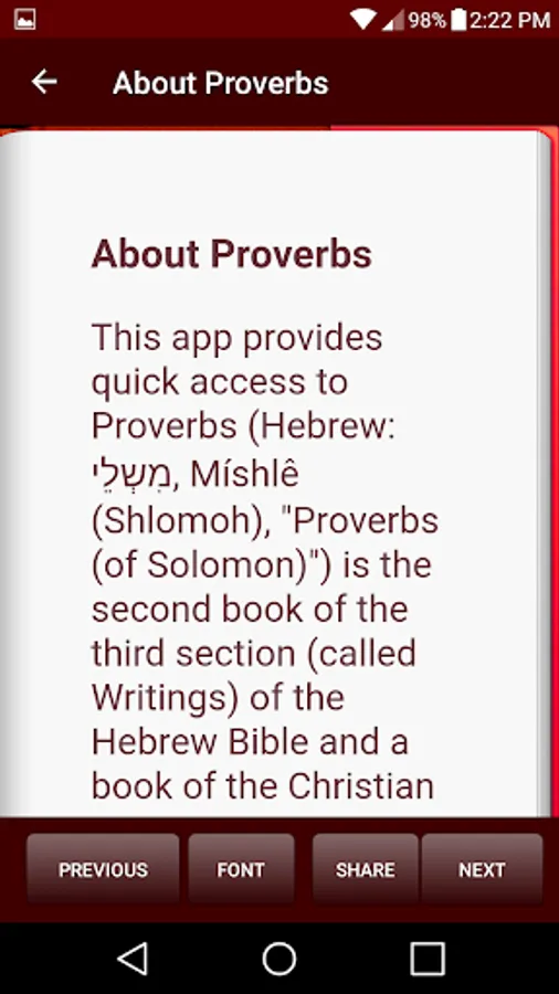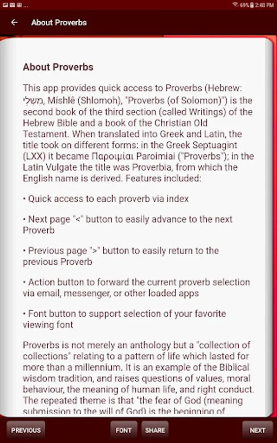 This app provides quick access to Proverbs (Hebrew: מִשְלֵי, Míshlê (Shlomoh), "Proverbs (of Solomon)"), the second book of the third section (called Writings) of the Hebrew Bible and a book of the Christian Old Testament. Features included: