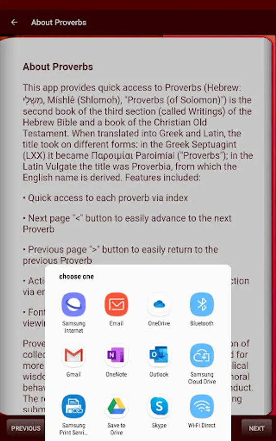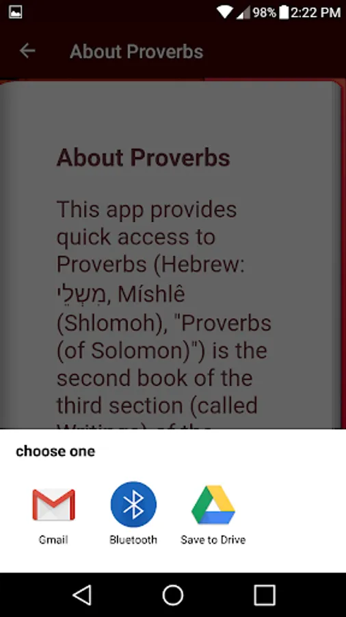 Action button to forward the current proverb selection via email, messenger, or other loaded apps