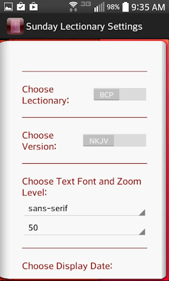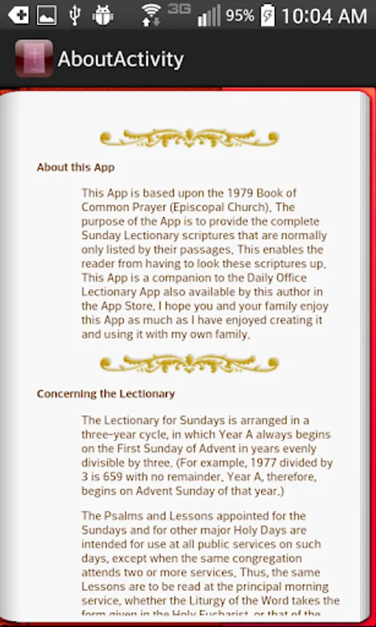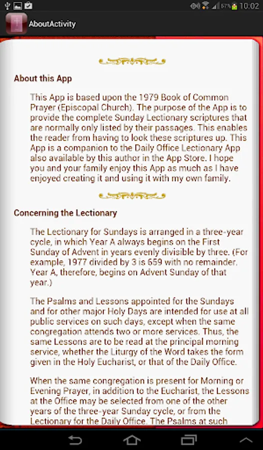 The purpose of the App is to provide the complete Year A, B, and C Sunday Lectionary scriptures that are normally only listed by their passages. In the past, the reader would look up the passages in the Book of Common Prayer for the applicable Year and date. Next they would individually open their Bible to the passage to obtain the reading.