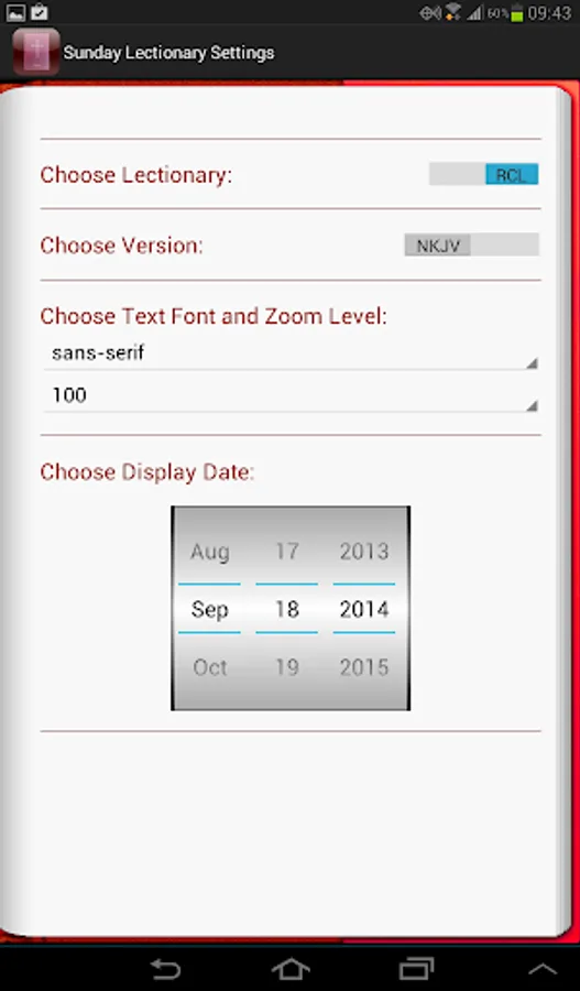To select the Revised Common Lectionary (RCL), click the Settings button, then slide the switch from BCP to RCL in the top right corner of the Settings display. You will need to close and reopen to app after changing the Lectionary setting.